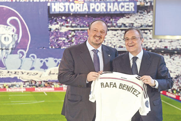 قدم نادي ريال مدريد الإسباني لكرة القدم أمس رافائيل بنيتيز مدرباً جديداً له للمواسم الثلاثة المقبلة، خلفاً للإيطالي كارلو أنشيلوتي.وقال فلورنتينو بيريز رئيس النادي الملكي: "اليوم نبدأ حقبة جديدة ونحن على قناعة بأنها ستكون أفضل... لذا يوجد هنا اليوم المدرب الجديد رافائيل بنيتيز... مرحباً بك في ريال مدريد".