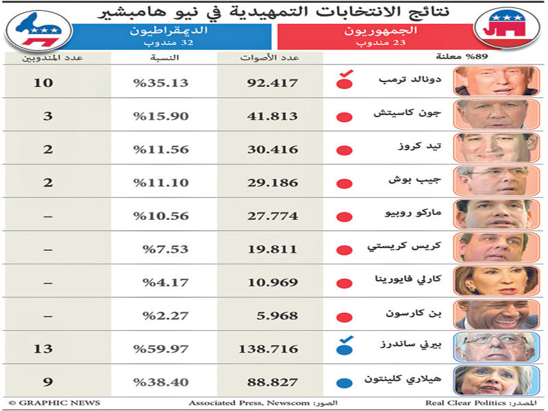 في تطابق مع استطلاعات الرأي بخلاف ما حصل في ولاية أيوا، فاز سيناتور فيرمونت الديمقراطي الاشتراكي بيرني ساندرز، والجمهوري قطب العقارات دونالد ترامب في الانتخابات التمهيدية بولاية نيوهامشير.ومنيت الديمقراطية هيلاري كلينتون بهزيمة نكراء، كما فشل مرشحو الحزب الجمهوري الآخرين في الاقتراب من ترامب، في خطوة اعتبرها المراقبون تعبيرا عن غضب الناخبين تجاه مؤسسات الحكم.الجمهوريوننيوهامشير التي تصنف من بين الولايات المعتدلة، حيث إن أصوات المتدينين لا تشكل عصباً أساسيا فيها، أعطت التقدم للملياردير دونالد ترامب بنسبة 34 في المئة، في حين حل ثانيا جون كاسيتش بنسبة 16 في المئة، ليصنع المفاجأة التي تحدث عنها الجميع بعد المناظرة الأخيرة التي خاضها مرشحو الحزب الجمهوري السبت الماضي.مفاجأة أعطت للحزب الجمهوري أملا في إعادة تقديم مرشح قادر على إعادة تقديم خطاب وسطي ليس فقط من أجل الفوز في السباق في نوفمبر المقبل، بل ومن أجل إعادة توحيد الحزب.وكان لافتا حجم الأصوات التي دعت الى خوض نقاش جاد مع مرشحي هذا الحزب لإقناعهم بالتنازل لمصلحة مرشحين يمكنهم من تشكيل «حالة» سياسية تعيد للحزب بريقه، على الرغم من سيطرته على مجلسي الشيوخ والنواب.ففي بلد كالولايات المتحدة، حيث الرئيس هو رأس السلطة، تبقى كل المواقع دونه مرتبة.ترامب الذي فاز بـ 34 في المئة من الأصوات، خسر في المقابل نحو 66 في المئة من الجمهوريين الذين توزعت أصواتهم على المرشحين السبعة الآخرين.واعتبر المعلقون أن التحدي الأبرز أمام الجمهوريين هو في تكتيل تلك النسبة وراء مرشح واحد إذا أمكن ما قد يمكنه من هزيمة كل من ترامب وكروز، الأول كـ «دخيل» على الحزب والثاني كمتمرد عليه لمصلحة «حزب الشاي» الأكثر تشددا.خطاب النصر الذي ألقاه ترامب بعد إعلان النتائج لم يقدم شيئا جديدا، لا بل أمعن في سطحيته وفي ترديد مقولاته الممجوجة عن إعادة قوة أميركا وهزيمة منافسيها من الصين واليابان الى المكسيك وبناء الجدار العازل والدفاع عن حمل السلاح وتعزيزه لحمايتها.في المقابل، جاء خطاب جون كاسيش الذي حل ثانيا أكثر عقلانية وهدوءا، مشددا على كيفية إعادة توحيد الأميركيين، وعلى الحفاظ على القيم التي نشأت عليها أميركا، مبتعدا عن اللغة التحريضية والخلافية.ومع التنافس الشديد بين تيد كروز وجيب بوش على احتلال المركز الثالث في نيوهامشير، يمكن القول ان المؤسسة الحزبية انتقمت بشكل غير مباشر من المتطاولين عليها، في حين تولت النتائج نفسها التحدث عن الوقائع.وقال الخبير السياسي ستيفن سميث من جامعة واشنطن في سانت لويس إن نيوهامشير «تنعش ترشيحه، إذ تثبت أنه يحظى بتأييد يوازي روبيو أو كروز»، كما أن «لديه على الأرجح أموالا أكثر من كاسيش أو روبيو لينفقها، وسيتمكن من خوض حملة على نطاق واسع» في الانتخابات التمهيدية المقبلة في كارولاينا الجنوبية في 20 الجاري ونيفادا في 23 منه».والصفعة الكبرى تلقاها ماركو روبيو الذي حل خامسا، ليحصد نتائج المناظرة «المشؤومة» السبت الماضي، مع تراجع حجم مؤيديه وتشبيهه بباراك أوباما، قائلين إن قلة خبرته ستسبب خسائر تضاف الى تلك التي سببها أوباما. ويذكر كثيرون أنه منذ عام 1944 فإن الفائز الأول أو الثاني في انتخابات نيوهامشير هو الذي ينال ترشيح الحزب الجمهوري. الديمقراطيونفي الجهة الديمقراطية لم يكن أحد يتوقع فوز هيلاري كلينتون التي أعطتها الاستطلاعات نتائج مبكرة عن خسارتها للولاية، رغم أنها فازت فيها عام 2008 مقابل باراك أوباما.لكن تحليل معطيات الفوز الذي حققه منافسها بيرني ساندرز، لعله يقرع جرس إنذار لحملتها، خصوصا أن مسيرة الانتخابات ستسلك من الآن فصاعدا وتيرة سريعة، مع توالي الانتخابات في ولايتي ساوث كارولينا ونيفادا الاسبوع المقبل، ثم «الثلاثاء الكبير» الشهر المقبل، حيث تجرى الانتخابات التمهيدية في 17 ولاية معا.ساندرز الذي فاز بنحو 60 في المئة من أصوات ديمقراطيي نيوهامشير مقابل نحو 40 في المئة لكلينتون، حقق أرقاما لافتة، حيث نا