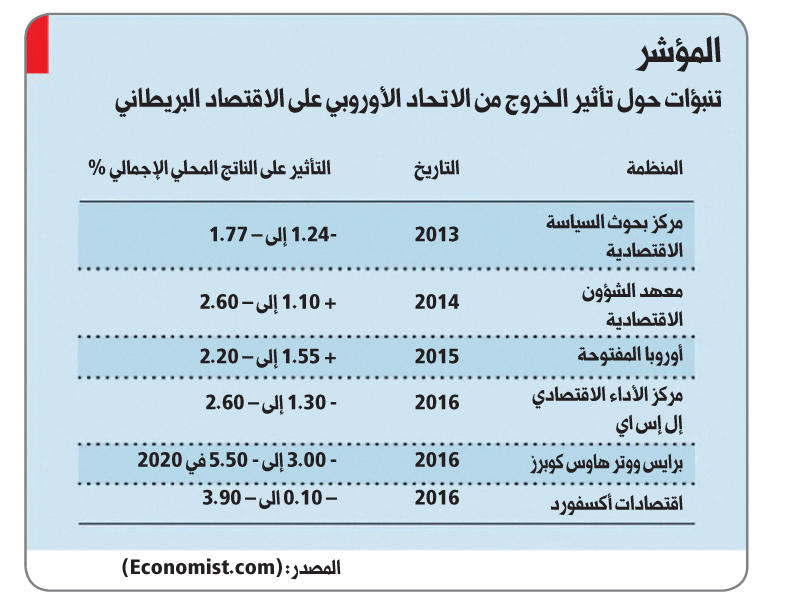 قد يكون التأثير الذي يخلفه خروج بريطانيا من الاتحاد الأوروبي بالنسبة الى اقتصادها القضية الأكثر أهمية وحيوية في ضوء اقتراب الاستفتاء الذي سوف يجرى في 23 يونيو المقبل، والعديد من الأشخاص المترددين ازاء قرارهم حول التصويت يقولون إنهم سوف يتخذون قرارهم على أساس فكرة واحدة تقول هل يحتمل أن يجعلهم خروج بريطانيا من الاتحاد الأوروبي أحسن، أو أسوأ، حالاً، ويصعب تقييم المجادلات المتعلقة بهذا الأمر.ويقول أندرو تايري وهو عضو البرلمان عن حزب المحافظين والذي يرأس لجنة الاختيار في الخزانة العامة التي تحقق في تكلفة وفوائد عضوية الاتحاد الأوروبي، إن جانبي الجدال "على استعداد لأن يضعا جانباً كل المؤهلات والقيود في مزاعمهما"، وهو يأمل أن تحقق لجنته أداء أفضل على الرغم من الانقسام الذي يعصف بها أيضاً.غياب الوقائع المضادةويلاحظ تايري أنه عندما يتعلق الأمر بخروج بريطانيا من الاتحاد الأوروبي فإن المشكلة "الرئيسة تتمثل في عدم وجود وقائع معاكسة"، ففي شهر أكتوبر الماضي، على سبيل المثال، خلصت دراسة أجراها بنك انكلترا الى أن عضوية الاتحاد الأوروبي قد حسنت الاقتصاد البريطاني عن طريق جعله أكثر ديناميكية. ويصعب توفيق ذلك مع مزاعم أنصار خروج بريطانيا من الاتحاد بأن تلك العضوية قد ألحقت الضرر بالبلاد.وعلى الرغم من ذلك فإن قضية الديناميكية الجديدة قد تكون غير ذات صلة وكما يقول المشككون في عضوية بريطانيا في الاتحاد الأوروبي، ربما تكون اصلاحات تاتشر في ثمانينيات القرن الماضي أسهمت في خفض الضرائب والاجراءات الروتينية.ويشكل غياب الوقائع المضادة مشكلة أكبر ازاء تقييم التأثيرات الاقتصادية لخروج البلاد من الاتحاد الأوروبي – وليس في وسع أحد التأكد من آفاق تحقيق بريطانيا لسوق واحدة، وما الذي سوف تكون عليه أنظمتها وقوانينها المتعلقة بالهجرة، وكم هي المدة المطلوبة للتفاوض حول مثل تلك الأمور.وعمد العديد من الفرق من الاقتصاديين الى طرح تخمينات في هذا الشأن، ويظهر الجدول المصاحب خلاصة ست من أكثر الدراسات شمولاً، كما تظهر الشريحة العريضة لتوقعات الناتج المحلي الاجمالي درجة الشك في النتائج المستخلصة. جوانب الاتفاقشيء واحد يتفق عليه أنصار ومعارضو الاتحاد الأوروبي، وهو أنه من المرجح أن تكون تأثيرات خروج بريطانيا من الاتحاد في الأجل القصير سلبية، كما أن الشك في ترتيبات التجارة في المستقبل قلص في الأساس من الثقة في الجنيه الاسترليني كما قد أضعف التوجه نحو الاستثمارات. ويعتبر بنك انكلترا خروج بريطانيا من الاتحاد المجازفة الأكبر بالنسبة الى الاستقرار المالي المحلي، ثم إن بلوغ بريطانيا مستويات قياسية من عجز الحسابات الجارية، الذي يتعين أن يمول من تدفقات رأس المال من الخارج، يجعل البلاد معرضة للعجز بقدر أكبر.والتأثيرات في الأجل الطويل هي أكثر إثارة للجدل، على الرغم من أن معظم الاقتصاديين يقولون انه من المحتمل أن تكون سلبية أيضاً، ولا يرجع ذلك الى أن الأمر سوف يتطلب سنوات عديدة كي يتعافى الاقتصاد متجاوزا انتاج الأجل القصير – هذا إن حدث – وقد وجد خبراء الاقتصاد 5 طرق يمكن أن يؤثر من خلالها خروج بريطانيا من الاتحاد الأوروبي على مستقبل الناتج المحلي الاجمالي.والخسائر الناجمة عن تدني التجارة هي الأكبر بأشواط، وفي وقت متأخر من هذا الشهر سوف ينشر مركز التفكير وهو مركز الإصلاح الأوروبي نسخة منقحة عن دراسته لعام 2014 حول خروج بريطانيا من الاتحاد الأوروبي مبنية على عمل اقتصاديين من جامعة غروننغن في هولندا.وتستنتج تلك الدراسة أن تجارة بريطانيا مع الاتحاد الأوروبي كانت أعلى بنسبة 55 في المئة مما كان يمكن لها أن تحققه من دون تلك العضوية، وأنه لم يتم رصد خسائر عبر تحويل التجارة من دول ثالثة الى الاتحاد.وحتى إذا كان بعض تلك المكاسب عرضة للخطر نتيجة خروج بريطانيا من الاتحاد فإن ذلك سوف يتفوق على التأثير الاقتصادي الناجم عن قطع اسهام بريطانيا السنوي بحوالي 8.5 مليارات جنيه استرليني في ميزانية الاتحاد ا