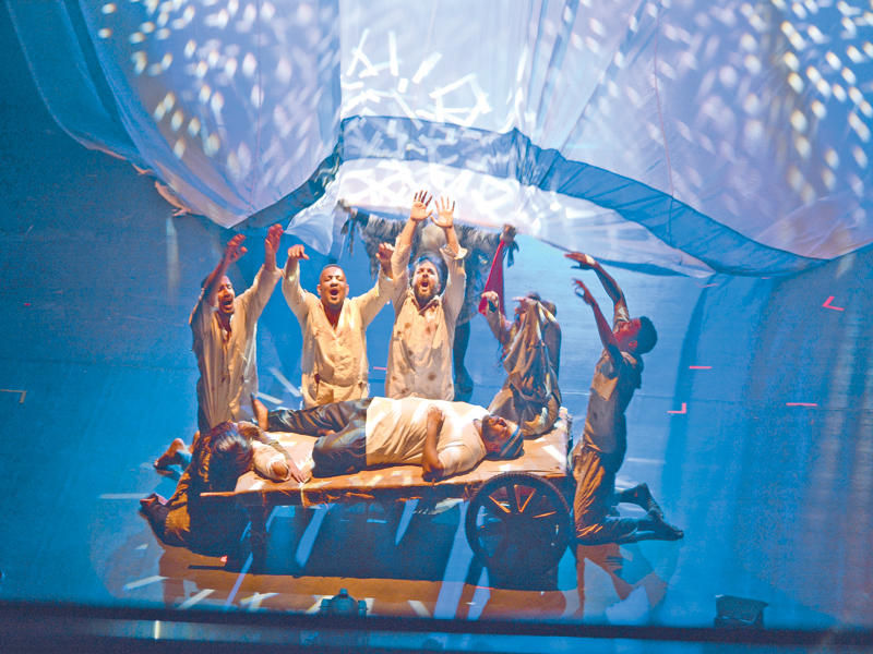 "اقصص رؤياك"، ولا "تقصص رؤياك"، جملتان اعتراضيتان ظل بطل العرض الذي جسد شخصية منار تائها بينهما، إما أن يسمع رأي الزوجة، أو أنه ينجرف وراء العرافة في تلك الرؤية التي حاصرته في منامه، وحالة الصراع النفسي الذي أحاط به وبزوجته.إخراج متناغم واستطاع المخرج العامري أن يقدم إمكاناته الإخراجية من خلال تحريك فريق عمل متكامل ببطولة جماعية وانسجام بين الممثلين جميعا، فلم يتبع في رؤيته البطل الأوحد متناغماً مع الحبكة الرئيسة التي يدعو إليها النص والحال العربي المأسوي من آلام الجوع وإهدار كرامة الإنسان، وعرض النساء في سوق الجواري، ومتعاطي الحشيش، وطرح الفكر الإرهابي والمتطرفين والتستر خلف اللحى، وتطرف الفكر والدين لتحقيق الرغبات والنزوات الشخصية.جمالية الصورةواهتم العامري بإظهار الصورة الجمالية لعرضه المسرحي من حيث السينوغرافيا الباهرة والإضاءة التي كانت حاضرة برونقها الأخاذ طوال العرض المسرحي، ولاسيما حالة الانتقال الرائع واختياره للموسيقى والمؤثرات الصوتية التي أوضحت تشعب القضية التي يطرحها النص بجرأة، والقدرة على التعامل مع عمق المسرح والفضاء المسرحي الذي تتميز به خشبة مسرح عبدالحسين عبدالرضا، وهي جمالية المشهد الختامي ومرونة الممثلين في الصعود والهبوط في العربة المتحركة التي جمعت أطيافا متعددة القضايا، والمشاهد الحركية الجماعية والتناغم بين الكلمة ولغة الجسد، وصولا إلى موت الزوجة منار المستسلمة تحت تلك العربة، ونجاة طفلها، وهو بصيص أمل المستقبل.المسرحية من بطولة كل من إبراهيم سالم، حميد سمبيج، ملاك الخالدي، مروان عبدالله، بدور، رائد الدالاتي، يوسف الكعبي، هيفاء العلي، علي الحيالي، عذاري، عثمان جوهر، محمد درجلك، عيسى صلبوخ، أحمد درجلك، علي درجلك.