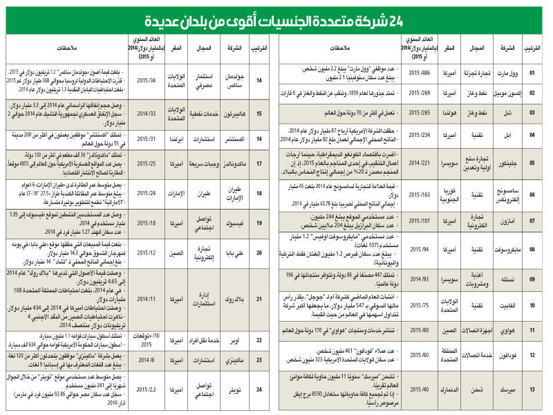وحددت "فورين بوليسي" قائمة بمجموعة من الشركات متعددة الجنسيات، التي تعد أقوى من دول عديدة، وكان نصيب الأسد للشركات الأميركية، حيث حصدت 14 مركزاً، وكانت المرتبة الأولى من نصيب "وول مارت". - اعتمدت القائمة على حجم الإيرادات السنوية، في ترتيب الشركات بالقائمة المختارة، فيما لا تمثل بالضرورة الترتيب لأكبر الشركات العالمية من حيث الإيرادات.- جاءت "طيران الإمارات" الشركة العربية الوحيدة بالقائمة، بعد أن شغلت المركز الـ18، حيث أثنى التقرير على جودة أسطول طائراتها.(أرقام)