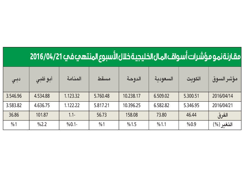 انهت مؤشرات أسواق دول مجلس التعاون الخليجي أسبوعها الثالث من هذا الشهر على أداء إيجابي، وبارتفاع على أغلبها، حيث لم يتأخر باللون الاحمر سوى مؤشر السوق البحريني الذي خسر نسبة محدودة جدا كانت عُشر نقطة مئوية، بينما كان مؤشر أبوظبي الافضل اداء وبنسبة 2.2 في المئة، تلاه القطري بنقطة ونصف النقطة المئوية، ثم تعادلت أربعة اسواق تقريبا بمكاسب متساوية كانت نقطة مئوية، وهي السعودية ومسقط ودبي والكويت.وبعد تردد وحذر شديد في بداية الأسبوع، حيث كان الجميع على موعد واستحقاق مهم، وهو اجتماع الدوحة للدول المصدرة للنفط من داخل وخارج اوبك، والذي انتهى على غير اتفاق وبنتائج مخيبة بدأ بعدها سعر النفط يتراجع في بداية تعاملاته الاسبوعية، ثم ما لبث ان استعاد ما خسر وبدفع من اضراب عمال النفط الكويتيين الذين انهوا اضرابهم قبل إعلان المخزون الاميركي للنفط الخام، حيث جاء أقل من التقديرات، ما دعم الاسعار مرة اخرى إلى ان تصل الى اعلى مستوياتها هذا الاسبوع.مكاسب في الإمارات وقطربعد تذبذب بين جلسة وأخرى ومنذ بداية الأسبوع الى ما قبل نهايته كانت النتيجة سعيدة وايجابية وبمكاسب بنحو نقطة مئوية هي جل مكاسب مؤشر دبي المالي الذي ربح 1 في المئة كمحصلة اسبوعية، بعد أربع جلسات متعادلة، ليقفل على مستوى 3583.82 نقطة، مضيفا 36.86 نقطة، بينما حقق مؤشر ابوظبي مستوى جديدا لهذا العام بعد نمو هو الافضل خليجيا بنسبة 2.2 في المئة تعادل 101.87 نقطة ليقفل على مستوى 4636.75 نقطة.وتعادل السوقان في عدد الشركات المعلنة عن نتائج الربع الاول التي لم تتجاوز أصابع اليد الواحدة، وبتباين واضح في النتائج، حيث تفاوت كبير في الارقام بين من نمت أرباحه او تراجعت في البعض الآخر، خصوصا قطاع المصارف الاكثر تأثيرا على مستوى السوق كاملا، ومؤشر لنتائج بقية اسهم القطاع او السوق اجمالا.وكان نمو الأسواق العالمية ذا اثر على سوقي الامارات، حيث تواجد المتداول الاجنبي الذي يتأثر ويقارن بين الاسواق الاماراتية وفرصها والاسواق العالمية التي سجلت مكاسب كبيرة ابرزها على مستوى داو جونز الذي تخطى مستوى 18 الف نقطة مدعوما بارتدادات اسعار النفط التي سجلت اعلى مستوياتها هذا العام بعد بلوغ الخام الاميركي مستوى 44 دولارا، ومقاربة برنت مستوى 46 دولارا.واستطاع مؤشر سوق الدوحة أن يسجل أفضل ثاني مكاسب بعد ابوظبي، حيث ربح 1.5 في المئة، تعادل 158.08 نقطة، ليقفل على مستوى 10396.25 نقطة، وكانت اسعار الطاقة تدعم نموه بعد ارتفاع اسعار النفط التى دعمت اسعار الغاز، والتي تجاوزت دولارين لكل مليون وحدة حرارية بريطانية، ومالت نتائج كبرى الشركات القطرية الى إعلانات ايجابية عدا بعض البنوك الصغيرة التي تراجعت ارباحها، لكن الدعم الاكبر من بنك قطر الوطني الذي سجل نموا بنسبة 7 في المئة.عمان والسعوديةواصل مؤشر سوق مسقط صحوته، عبر تسجيله أعلى مستوياته لهذا العام، بل ابتعد كثيرا واقترب من 6 آلاف نقطة، بعد أن اقفل امس الاول على مستوى 5817.21 نقطة، بعد ان اضاف خلال الاسبوع 56.73 نقطة هي نقطة مئوية، بعد ان سجلت 5 بنوك ارتفاعا في الارباح مقابل تراجع مصرفين فقط في بداية اعلانات الربع الاول، بينما تقاسم قطاع الصناعة النمو والتراجع، حيث تراجع نمو نصف الشركات في القطاع لكنه لم يؤثر كثيرا على حركة المؤشر الذي رسم له مسارا صاعدا قبل بقية المؤشرات الخليجية. في السعودية كانت النتائج في معظمها متراجعة بعد ان انتهت معظم الشركات المدرجة من اعلاناتها، وهي اول سوق تبدأ بالإعلان، وكانت الشركات تأثرت تارة بخفض دعم الطاقة وتارة اخرى وبترابط اقتصادي بتراجع اسعار النفط، محور الاقتصاد الوطني الرئيسي، لكن رغم النتائج استطاع مؤشر "تاسي" تحقيق نتيجة ايجابية مدعوما بأسعار النفط، حيث حقق 1.1 في المئة هي 73.8 نقطة، ليقفل على مستوى 6582.82 نقطة متجاهلا النتائج الفصلية لشركاته هذا الاسبوع.تباين مؤشرات الكويتسجلت مؤشرات سوق الكويت للاوراق المالية تباينا واضحا، حيث اقفل المؤشر الرئيس "السعري" على ارتفاع جيد بنحو نقطة م