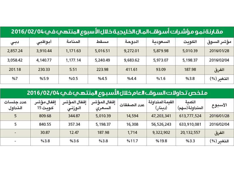 بداية ونهاية سعيدتانجاءت نهاية تعاملات سوقي الإمارات دبي وأبوظبي كبدايتها، حيث هناك ارتفاعات قوية جاءت مكملة لتعاملات الأسبوع الأخير من شهر يناير، والذي أعاد للأسواق الخليجية وأسعار النفط على حد سواء جزءاً مهماً من خسائر بداية العام، والتي صنفت انهيارات للاسواق المالية وأسعار السلع، خصوصا اسعار النفط التي تهاوت بشدة، وفقدت 25 في المئة أول ثلاثة أسابيع من شهر يناير المنصرم.وأضاف استقرار النفط حول أعلى مستوياته بدعم من حديث جدي لدعم الأسعار من قبل مصدري النفط من داخل وخارج «اوبك» دعما جيدا للسوق، إضافة إلى اعلانات قطاع البنوك في دبي، حيث سجل 4 منها ارتفاعا في الأرباح مقابل تراجع في ارباح البنك التجاري في دبي، ليقفز مؤشر سوق دبي المالي مجددا ومكملا استعادة خسائره متخطيا مستوى 3 آلاف نقطة للمرة الأولى، بعد أن فقده في بداية هذا العام، ليقفل على مستوى 3058.42 نقطة حاصداً 21.18 خلال اربع جلسات خضراء من إجمالي خمس جلسات اسبوعية خسر أوسطها فقط.وارتبط أداء مؤشر أبوظبي بأسعار النفط واداء الأسواق العالمية بشكل أكبر من ارتباطه مع اعلانات النتائج السنوية في قطاع البنوك والمؤسسات المالية، والتي سجل منها 7 مؤسسات تراجعا في الأرباح مقابل نمو في 4 فقط، ولكن السوق في حالة تقييم للحالة الاقتصادية المستقبلية العامة، والتي يؤثر بها اسعار النفط، لذلك استمر مؤشر أبوظبي بتعويض الخسائر للاسبوع الثاني على التوالي، ليربح 5.9 في المئة تعادل 230.33 نقطة، ليستعيد هو الآخر مستوى 4 آلاف نقطة، ويقفل على مستوى 4140.77 نقطة.الدوحة ومسقطوربح مؤشرا قطر وعمان نسبا متقاربة كانت 4.4 و4.5 في المئة على التوالي، بعد إعلان أغلب الشركات القطرية والعمانية نتائجها السنوية، والتي أتت متباينة حيث الدعم من قطاع البنوك في عمان بعد نمو معظمها، إذ انتهى القطاع من الإعلان، بينما جاء الضغط من قطاع الصناعة، وبطبيعة الحال فإن السوقين مرتبطان بأسعار النفط، كما اسلفنا سابقا وحال جميع الأسواق الخليجية والعالمية في أغلب جلسات هذا العام. وابتعد مؤشر مسقط عن مستوى 5 آلاف نقطة مرتفعا الى مستويات 5240.49 نقطة، بعد أن أضاف 4.5 في المئة تعادل 223.98 نقطة، بينما اقفل مؤشر سوق قطر على مستوى 9683.62 نقطة رابحاً 411.61 نقطة.صفقة أمريكانا في الكويتبالإضافة الى عاملي النفط وتوزيعات من أعلن من قطاع البنوك، والتي جاءت إيجابية وأعلى من التقديرات التي قلصتها بعد تراجع اسعار النفط بداية العام، ورجح أن تأتي متحفظة، ربحت مؤشرات سوق الكويت للاوراق المالية دما جديداً ومحفزات من العيار الثقيل، حيث اعلنت تفاصيل صفقة بيع بنسبة 69 في المئة من اسهم شركة امريكانا والمملوكة لشركة الخير إلى شركة اماراتية، بسعر قد يتجاوز 4 مليارات دولار، وهو ما يدعم دعما واضحا محافظ قروض البنوك، والتي تحوي اصولا مرهونة لبعض شركات المجموعة مما يحررها. وعلى وقع هذا الخبر، جاءت نتائج مؤشرات السوق الكويتي ايجابية وقريبة من منطقة الوسط خليجيا، حيث هناك ارتفاعات متقاربة لمؤشرات السوق الرئيسية الثلاثة، إذ تعادل مؤشر السوق «السعري» مع «كويت 15» رابحين نسبة 3.8 في المئة، ليقفل الأول على مستوى 5198.37 نقطة، بعد ان اضاف 187.98 نقطة، واستقر الثاني على مستوى 84.55 نقطة رابحا 3.87 نقطة، بينما حقق «الوزني» ارتفاعا اقل بنسب عُشري نقطة مئوية 3.6 في المئة، تعادل 12.47 نقطة ليقفل على مستوى 357.34 نقطة.ودعمت تداولات الجلسات الأخيرة مستوى السيولة لترفعها بنسبة قاربت 2 في المئة، مقارنة بالأسبوع الأخير من شهر يناير، وسجل النشاط نمواً أقل، حيث بقي التركيز على الأسهم القيادية، ولم تتجاوز ارتفاعاته نسبة 3.3 في المئة، وارتفع عدد الصفقات بنسبة 11.7 في المئة، وذهبت الأفضلية إلى تعاملات الأسهم القيادية خلال ارتفاعات النفط، بينما على وقع الخبر نشطت اسهم مرتبطة بكتلة الاستثمارات، وحققت مكاسب كبيرة بنهاية الأسبوع. السعودية والبحرينحقق مؤشر «تاسي» السعودي ارتفاعا محدودا مقارنة ببقية الأسواق الخليجية عدا البحرين، ولم تصل مكاسب