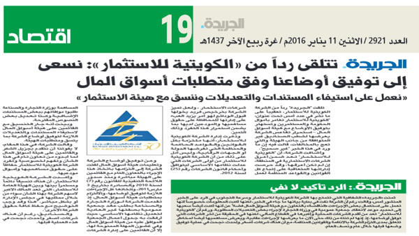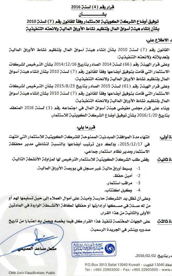 أعلنت هيئة أسواق المال رسمياً إنتهاء مدة الموافقة المبدئية الممنوحة للشركة الكويتية للاستثمار، وذلك بسبب عدم ترتيب أوضاع الشركة بالنسبة لنشاطي مدير محفظة الاستثمار ومدير نظام الاستثمار الجماعي .