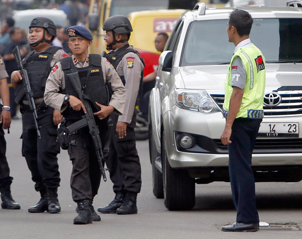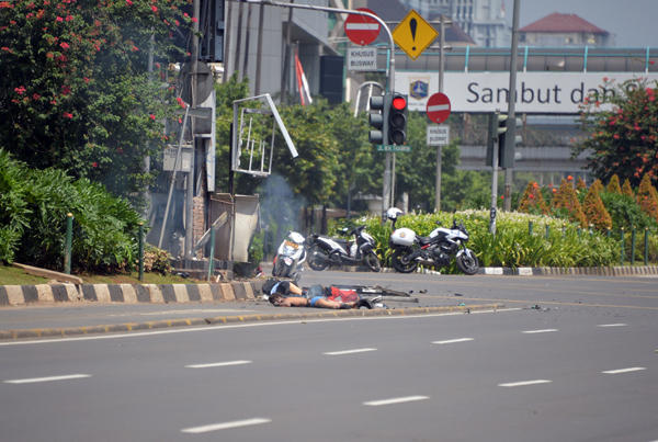 وقال المتحدث باسم شرطة المدينة محمد إقبال إن ثلاثة رجال شرطة أصيبوا بإصابات خطيرة في الهجوم بالقرب من مركز ساريناه للتسوق بوسط جاكرتا.وقال لشبكة تي في ون «لقد قُتِلَ أربعة مهاجمين في تبادل لإطلاق النار مع الشرطة».أعمال إرهابيةوأعلن الرئيس جوكو ويدودو في كلمة بثتها قناة «مترو تي في» الخميس أن الانفجارات «أعمال ارهابية»، وقال «يجب ألا تشعر أمتنا وشعبنا بالخوف، لن تهزمنا هذه الأعمال الإرهابية»، مضيفاً أن السلطات «تندد بهذا العمل الذي أثار الرعب بين السكان». وأشار مراسل فرانس برس إلى أن «إطلاق النار توقف حالياً إلا أن منفذي الهجوم لا يزالون فارين ولا نزال نخشى حصول إطلاق نار جديد».وتابع اأن شرطيين مدججين بالسلاح قاموا بإجلاء جريح بينما تحلق مروحيات فوق مكان الانفجارات.وطلب عناصر الأمن في المكان من صحافيي فرانس برس «الابتعاد» عن الطوق الأمني.ولم تصدر أي معلومات على الفور حول مصدر الانفجارات.وكانت الشرطة الاندونيسية في حالة تأهب قصوى خلال فترة الأعياد في نهاية العام بعد أن أحبطت هجوماً انتحارياً في جاكرتا بمناسبة رأس السنة خطط له متطرفون مفترضون بعضهم مرتبط بتنظيم داعش بحسب الشرطة.وفي ديسمبر، أوقفت الشرطة خمسة أشخاص يشتبه بانتمائهم إلى شبكة قريبة من التنظيم الجهادي وأربعة آخرين على اتصال مع الجماعة الإسلامية المسؤولة عن تنفيذ هجمات على نطاق واسع في اندونيسيا.