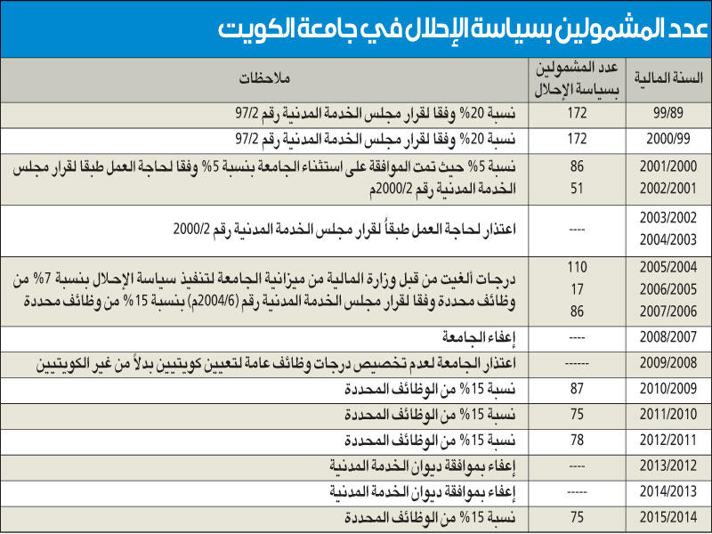 وأضاف: «كما صدر قرار مجلس الخدمة المدنية بشأن تعديل كيفية تنفيذ سياسة الإحلال، متضمنا قيام كل جهة بإجراء دراسة حول الوظائف التي يمكن إلغاؤها والمشغولة بالقوى العالمة الوافدة، بالقدر الذي لا يؤثر في مستوى الأداء».ولفت إلى صدور قرار مجلس الخدمة المدنية باجتماعه رقم 6/ 2004 باحتساب نسبة الإحلال، وفقاً لنوع المهن والوظائف وندرتها، عوضا عن احتساب هذه النسبة إلى العدد الإجمالي للوظائف، وتم تحديد هذه المهن بعدد 16 مهنة يتم تطبيق سياسة الإحلال بنسبة 7% من مجموع أعداد الموظفين غير الكويتيين الشاغلين لها للسنة المالية 2005/ 2006.وتابع العيسى: «التزمت جامعة الكويت بتنفيذ سياسة الإحلال، علماً بأن إعفاء الجامعة واعتذارها عن بعض السنوات تم بناء على موافقة الجهات المختصة، وتقديراً لطبيعة العمل بها وظروفها، ومنها: التزام الجامعة بتطبيق القانون رقم 24/ 96 بشأن تنظيم التعليم العالي (منع الاختلاط)، والقانون رقم 30/ 2004 بإنشاء وتنظيم المدينة الجامعية الجديدة، وذلك يتطلب الحاجة إلى زيادة عدد العاملين، سواء الكويتيين أو غيرهم».وأوضح: «تطور العمل بالجامعة واتساع نطاقه، بإنشاء بعض الكليات ومراكز العمل الجديدة، ومنها كلية العلوم الحياتية في 11 /6/ 2003، ومركز التعليم عن بُعد في 16/ 10/ 2002، ومركز الخوارزمي في 2/ 6/ 2006، بالإضافة إلى إنشاء كلية العمارة وكلية علوم وهندسة الحاسوب وكلية الصحة العامة، ونظرا لاستيعاب أعداد كبيرة من الطلبة، فقد ورد كتاب ديوان الخدمة المدنية رقم 20110203762، بتاريخ 16/ 10/ 2011، بإعفاء الجامعة من تطبيق سياسة الإحلال لسنتين ماليتين بدءاً من السنة المالية (2012/ 2013)، وبناءً على ما تقدم، يتبيَّن التزام الجامعة بتطبيق القرارات والتعليمات الصادرة بشأن تنفيذ سياسة الإحلال».وأضاف العيسى: «تتبع جامعة الكويت، كإحدى مؤسسات الدولة، نظام الإحلال في الوظائف الإدارية فقط. أما بالنسبة للوظائف الأكاديمية، ونظراً لطبيعتها الخاصة، فإنه لا يمكنها تطبيق نظام الإحلال والتكويت بسهولة، فجامعة الكويت تعتمد في سياستها على تعيين أعضاء هيئة التدريس، بما يكفل تغطية احتياجاتها التدريسية، وفق معايير أكاديمية معينة، ووفق أعداد الطلبة المتقدمين والمسجلين بالجامعة، وأيضا وفق التخصصات العلمية المطلوبة من قبل القسم العلمي، وبما يتيح لها مواكبة ما يستجد علمياً في المجال الأكاديمي التخصصي».وقال: «يساهم وجود أعضاء هيئة التدريس غير الكويتيين في الجامعة إلى جانب زملائهم الكويتيين بالوقت الحالي في خلق مستوى عالٍ من التفاعل والاحتكاك العلمي في نشاط اللجان الأكاديمية على مستوى القسم العلمي، ما يؤدي إلى إثراء وتنوع الخبرات في جميع أوجهها من أبحاث وطرق تدريس واستشارات مهنية، وغيرها من المجالات الأكاديمية».واستطرد قائلاً: «أما بالنسبة للرؤية الاستراتيجية للجامعة، بخصوص تعيين أعضاء هيئة تدريس من الكويتيين، فإن جامعة الكويت تطمح دائماً إلى إعداد أعضاء هيئة التدريس الكويتيين عن طريق خطة البعثات، حيث تقوم سنوياً بابتعاث الطلبة الكويتيين، لدراسة الماجستير والدكتوراه في جامعات معتمدة من القسم العلمي والكلية والجامعة، وفق آلية نظام البعثات، ويتم ذلك بصورة دورية، لتغطية احتياجات التخصصات العلمية المختلفة، بالإضافة إلى برنامج الابتعاث لما بعد الدكتوراه».وفي ختام رده، قال العيسى: «نشير إلى أن الرؤية الاستراتيجية للجامعة في تعيين أعضاء هيئة التدريس من غير الكويتيين تتفق مع النظم المعمول به في الجامعات العالمية والمتميزة التي تقوم باستضافة الأساتذة الزائرين والممتحنين الخارجيين وأعضاء لجنة التقييم على المستوى العلمي من خارج الجامعة، على اختلاف جنسياتهم، ووفق المعايير الموضوعة، وهو أمر حرص عليه المشرع عند إصدار قانون الجامعة، ما يسهل عليه الاعتراف الأكاديمي لجامعة الكويت، وقبول الطلبة المبتعثين في أرقى الجامعات العالمية، وستحقق هذه الرؤية المزيد من التنمية العلمية والمهنية للأكاديميين الكويتيين، وبما 