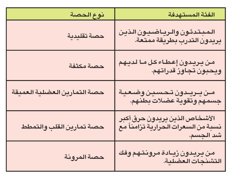الحصة التقليديةتكون هذه الحصة مناسبة لجميع المستويات، إذا أراد الفرد استئناف الرياضة أو الحفاظ على رشاقته. تنشط جميع العضلات بإيقاع ثابت، على وقع موسيقى حيوية، ما يسمح بحرق بين 400 و600 سعرة.يجب التنقل بين ثلاثة أو أربعة تمارين على كل أغنية، أثناء الوقوف أو التمدد على الأرض، للتحكم بالحركة وفقدان أكبر نسبة من الطاقة.تشمل الحركات ثني الساقين والقفز وحركة المقص... يستحيل أن تضجر وسط هذا الجو الممتع!رأي الخبراء: تسمح بساطة هذه الحصة بالشعور براحة فورية مع أنها قد تبدو خفيفة بالنسبة إلى أصحاب الخبرة في مجال الرياضة.الحصة المكثفةإذا كنت رياضياً وتسعى إلى زيادة متعتك أثناء التدرب، ستكون هذه الحصة مثالية لك! اعتباراً من الأغنية الثانية، ستبدأ بالتعرق وسيتسارع إيقاع قلبك تزامناً مع تكثيف تمارين تقوية العضلات ورفع مستوى تشغيل القلب والأوعية الدموية. في هذه الحصة، تتلاحق سلسلة من التمارين التي تزداد صعوبة: الاتكاء جانبياً على الذراع، الضغط على القدمين، حركات قرفصاء تشغّل الردفين... تستهدف هذه الحركات قوة التحمل وتزيد القدرة على مقاومة الجهود والألم!رأي الخبراء: ستتعب حتماً خلال هذه الحصة لكنك ستشعر في النهاية بالخفة والهدوء. سرعان ما تعتاد على هذا الإيقاع وسترغب في البدء من جديد... لكن بعد بضعة أيام! حصة التمارين العضلية العميقةبعيداً عن حركات القفز والتنسيق المستعملة في الحصص الأخرى، تسمح هذه الحصة بتقوية العضلات في العمق بفضل تمارين بطيئة على وقع موسيقى أكثر هدوءاً.لكن تستهدف هذه الحصة، رغم مظهرها الهادئ، القوة الجسدية ومستوى الحركية وتشغّل العضلات العميقة، وتحديداً على مستوى حزام البطن والظهر.تبقى الحركات بسيطة لكنها ترتكز على اختلال توازن الجسم، ما يجبرك على تشغيل العضلات التي بقيت جامدة لفترة طويلة.رأي الخبراء: قد تبدو هذه الحصة هادئة لكنها ستجعلك تتعرق كثيراً وستحسّن وضعك الجسدي. وقد ترتجف خلال بعض التمارين، لكنك ستحسّن طريقة تعاملك مع جسمك.حصة تمارين القلب والتمططتبدأ الحصة بالجمع بين تمارين القلب وتقوية العضلات طوال 30 دقيقة. تكون مراحل الراحة قصيرة جداً لتحسين الوضع الجسدي مقابل إطالة وقت الجهود. ثم يمكنك أن تستريح بطريقة ناشطة طوال 25 دقيقة عبر حركات تمطط حيوية تضمن تليين العضلات وتمديدها. لا يسهل دوماً القيام بحركات حيوية تليها تمارين جامدة، لكنها طريقة فاعلة لإطلاق العنان للجسم وفهم أهمية التمطط.رأي الخبراء: ينشط القلب بعد الركض ثم التوقف للقيام بحركات القرفصاء، وتكون مرحلة التمطط ممتعة وطويلة أكثر مما هي عليه في الحصص الأخرى.حصة المرونةهذه الحصة مستوحاة من اليوغا وتمارين البيلاتس وتهدف إلى تليين المفاصل والعضلات. وسط جو من الموسيقى الهادئة، تمارس تمارين التمطط والتوازن التي تتطلب تحسين مستوى التنفس والقوة. تبدأ الحصة بوضعيات سهلة وتستهدف أجزاءً مختلفة من الجسم. على مر الجلسة، تزداد صعوبة التمارين تدريجاً. لا وقت للضجر لأنك مضطر للتنقل بين الحركات الحيوية والجامدة. رأي الخبراء: تكون هذه الحصة متطلبة جداً وتحتاج إلى الكثير من التمطط والتركيز والتوازن وتشدد على طريقة التحكم بالجسم وزيادة الليونة. ستنهي الحصة وأنت تشعر بالرضى بعد التقدم الذي أحرزته.
