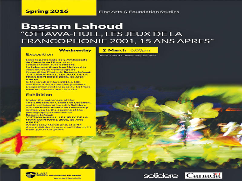 بمناسبة شهر الفرونكوفونية في لبنان، تنظم الجامعة اللبنانية -الأميركية بالتعاون مع شركة سوليدير وبرعاية السفارة الكندية في لبنان، معرضاً فوتوغرافياً للبروفسور بسام لحود بعنوان « أوتاوا-هول الألعاب الفرونكوفونية 2001، بعد 15 عاماً» ينطلق في الثاني من مارس في سوق الصاغة – أسواق بيروت ويستمر حتى 11 منه.
