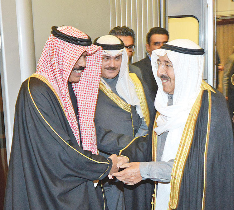 وكان في استقبال سموه على أرض المطار، سمو ولي العهد الشيخ نواف الأحمد، ورئيس مجلس الأمة مرزوق الغانم، ورئيس الحرس الوطني سمو الشيخ سالم العلي، وكبار الشيوخ، وسمو الشيخ ناصر المحمد، ورئيس مجلس الوزراء سمو الشيخ جابر المبارك، ووزير شؤون الديوان الأميري الشيخ ناصر صباح الأحمد، والنائب الأول لرئيس مجلس الوزراء وزير الخارجية الشيخ صباح الخالد، ونائب رئيس مجلس الوزراء وزير الداخلية الشيخ محمد الخالد، ونائب رئيس مجلس الوزراء وزير المالية وزير النفط بالوكالة أنس الصالح، والوزراء وكبار القادة بالجيش والشرطة والحرس الوطني.