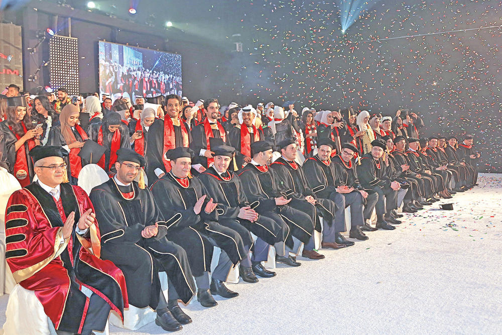صناعة الكمبيوترواستطرد العثمان: "أنه وأثناء وجوده في لندن إبان الغزو العراقي، وخلال التحاقه ببعض دورات الكمبيوتر، استحوذ على تفكيره موضوع صناعة الكمبيوتر وسوق الكمبيوتر وشركات الكمبيوتر، وتقنية المعلومات بشكل عام، الأمر الذي دفعه لتأسيس شركة لخدمات الكمبيوتر مباشرة بعد التحرير، وتم من خلالها التعاقد مع مؤسسة الخطوط الجوية الكويتية، لتوريد أحدث أجهزة الكمبيوتر وملحقاتها، إضافة إلى البرمجيات".وتابع: "تبين في ما بعد أن الأجهزة والبرمجيات التي تم توريدها لم تكن تستخدم بنسبة 80 في المئة، وان نسبة الاستخدام والاستغلال لم تتجاوز الـ20 في المئة، بسبب ندرة الأشخاص القادرين على تشغيل هذه الأجهزة وهذه البرمجيات والاستفادة منها".واردف: "هذه كانت النقطة الفاصلة لبدء التفكير في العنصر البشري والتنمية البشرية، ودور التدريب والتعليم في قطاع تقنية المعلومات، ولقد تم بالفعل الاتفاق مع شركة نيوهورايزن العالمية، والتي كانت من أكبر الشركات في قطاع الكمبيوتر وتقنية المعلومات في ذلك الوقت، وتم الاتفاق معهم لتمثيلهم في الكويت وفي عدد آخر من دول المنطقة".«دبلوم التدريب»وزاد العثمان: "قمنا بإعداد برنامج دبلوم التدريب الذي يحاكي الشريحة الموجودة في السوق، والتي تحتاج الى هذا النوع من التدريب والتعليم، وحقق هذا الدبلوم نجاحا كبيرا من الناحية المادية ونواح كثيرة أخرى، تمثلت في الانخراط في شراكات دولية استراتيجية مثل أوراكل ومايكروسوفت ونوفل، وغيرها".وأضاف: "مدنا ذلك بالكثير من الخبرة والتراكم المعرفي للعمل في هذا القطاع بمستوى احترافي عال، كما أهلنا آلاف الشباب للانخراط في سوق العمل، أو تحسين عملهم الحالي، وساعدنا الكثير من المؤسسات لتنفيذ مشاريعها وخططها، بتوفير عناصر بشرية مؤهلة".واستدرك: "في هذه الظروف تبلور جنين AUM، وبرزت صفاته الوراثية، حيث ترسخ وتولد لدينا أنه وفي خضم هذه الظروف، يجب أن نأخذ هذه التجربة إلى بعد أعمق، إلى بعد مؤسسي أكبر، وشاءت الأقدار أنه وفي نفس الوقت صدر قانون الجامعات الخاصة، فكان القرار الحتمي بتأسيس AUM، ولقد بدأ الإعداد للمشروع، واستغرق الأمر أكثر من سبع سنوات، وكانت البداية في عام 2008".عام الأزمةوأضاف العثمان: "عام 2008، هو الذي حدثت فيه الأزمة المالية، وتوقفت البنوك عن تقديم أي تسهيلات مالية، الأمر الذي وضعنا أمام خيارين؛ إما العمل من خلال مبنى مستأجر أقل في التكلفة وبمخاطر مالية أقل، وإما المضي قدما في بناء الحرم الجامعي".وقال: "قررنا المضي في بناء الحرم الجامعي، وفق خطتنا، رغم المخاطر والظروف الاقتصادية والمالية الصعبة، لسبب أساسي ومهم، حيث رأينا أننا لن نتمكن من تحقيق فلسفة (AUM التعليمية) إلا من خلال الحرم الجامعي، بما يوفره من بيئة تعليمية مناسبة، إذ ترتكز فلسفتها على محورين أساسيين؛ التحصيل العلمي المعرفي والأكاديمي الرصين للتخصصات المختلفة من جهة، وتنمية وبناء الشخصية القيادية العقلانية الإيجابية، التي تفكر بالإنجاز، وتؤمن بالنتيجة الشخصية المتسامحة المليئة بالحب، وتؤمن بقيمة العمل، وهي سمات مهمة لا تقل أهمية عن التحصيل العلمي المعرفي".نقطة قياسوأوضح العثمان: "وضعنا لأنفسنا نقطة قياس، لتقييم نجاح طلبتنا بعد التخرج، وقياس مدى نجاحهم في حياتهم المهنية والعملية، من خلال مركز توطين للتأهيل الوظيفي، الذي أنشأته جامعة الشرق الأوسط الأميركية، للقيام بالإرشاد الوظيفي للطلبة، وقمنا هذا العام بمضاعفة ميزانيته إلى ثلاثة أضعاف".ووجَّه العثمان حديثه للطلبة الخريجين، قائلا: "علاقة الجامعة معكم لن تنتهي بعد الحصول على الشهادة، لكنها ستنتقل إلى مرحلة أخرى، حيث سيلعب مركز توطين دور المستشار المهني لكم، آملين أن تستفيدوا منه في حياتكم المهنية". وظائف دون أعمالوأضاف العثمان: "لديَّ أمل، وعليكم ألا تقبلوا بوظائف بلا عمل أو مسؤولية حقيقية، فهذا النوع من الوظائف تدمير للذات، وسرطان ينخر في والمجتمع، فهذه الوظائف تعوّد الإنسان على عادات وسلوكي