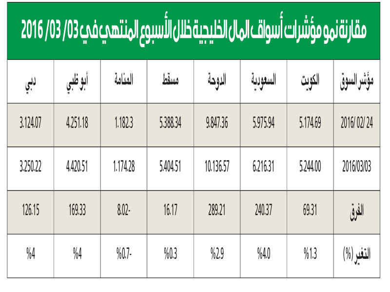للأسبوع الثالث على التوالي يستمر الأداء الايجابي والنمو في معظم مؤشرات أسواق دول مجلس التعاون المالية وبتفاوت كبير في الارتفاع الأسبوع الماضي، حيث كانت المكاسب الكبيرة للسوقين الأكثر سيولة السعودي والاماراتي بمؤشريه دبي وأبوظبي، حيث حققوا نسبة 4 في المئة، بينما ربح مؤشر قطر حوالي 3 في المئة، تلاه مؤشر سوق الكويت «السعري» محققا 1.3 في المئة، واستقر مؤشر سوق مسقط بحوالي ثلث نقطة مئوية فقط، وكانت الخسارة من نصيب السوق الأدنى سيولة خليجيا وبنسبة 0.7 في المئة.النفط ورغبة المصدرينيبدو أن هناك رغبة ملحة على رفع اسعار النفط بين مصدريه الكبار، بعد أن عانت الأسعار خلال 18 شهرا من خسائر وتراجعات دراماتيكية أطاحت بحوالي 75 في المئة من سعره، لتبدأ جولة مكوكية بين وزراء النفط في الدول المصدرة، سواء من داخل «أوبك» أو خارجها، لتدعم الشعور بارتفاع الاسعار، التي سجلت أعلى مستوياتها منذ شهرين، بالرغم من بعض البيانات التي تشير الى وفرة المخزون الأميركي وبلوغه مستويات قياسية.وكان آخر المؤشرات الإيجابية الخاصة بالنفط قد صدر مساء الخميس، حيث اشار الى نقص مخزون البنزين في دول آسيا للمرة الأولى منذ 15 عاما، حيث إن البنزين سلعة مرنة يزداد الطلب عليها، كما تراجع سعرها وعادت الاسعار مرة اخرى الى الصعود، ليبلغ برنت 37 دولارا، .وتجاوز الخام الأميركي الخفيف 35 دولارا، استفاد من الارتفاع الاخير مؤشر السوق السعودي الذي اقفل متأخرا بثلاث ساعات عن البقية، ويحوله الى ارتفاع واضح بعد تردد، ليكمل نسبة 4 في المئة من المكاسب الاسبوعية ومستمرا في تقليص خسائره السنوية التي أصبحت 10.6 في المئة فقط، بعد أن اقفل مؤشر «تاسي» على مستوى 6216.31 نقطة، مخترقا مستوى 6 آلاف نقطة للمرة الأولى، بعد خسارته في بداية العام، ومبتعدا عنه بعد أن جمع 240.37 نقطة خلال الأسبوع الماضي.ولم تكن مؤشرات سوقي الإمارات أقل من تعاملات السوق السعودي ايجابية، وحقق كلا المؤشرين 4 في المئة ليستمرا في استعادة خسائر بدايات هذا العام كحال السوق السعودي، واستطاع مؤشر دبي أن يربح 126.15 نقطة، مقفلا على مستوى 3250.22 نقطة، مبتعدا بشكل جيد عن مستوى 3 آلاف نقطة، بينما اقترب مؤشرأبوظبي من مستوى 4500 نقطة، بعد أن استقر حول 4420.51 نقطة، محققا نموا بـ 169.33 نقطة.قطر يربح 3% تقريباًبعد عمليات جني أرباح شهدها مؤشر سوق الدوحة المالي خلال الاسبوع الاخير من شهر فبراير، عاد خلال الاسبوع الماضي وحقق نموا جيدا ومتوسطا بين مؤشرات دول مجلس التعاون الخليجي، متجاوزا تراجع اسعار الغاز التي استمرت بالخسارة وسط تحسن أسعار اسعار النفط، التي قلصت تأثر مؤشر قطر ليعود للمكاسب وينهي اسبوعه على ارتفاع جيد بنسبة 2.9 في المئة تعادل 289.21 نقطة، ليتخطى مستوى 10 آلاف نقطة، والذي تردد بعض الشيء في تجاوزه كما «قدرنا خلال تقريرنا الأسبوعي السابق في «الجريدة»، ويقفل على مستوى 10136.57 نقطة.نمو كبير في مؤشرات سوق الكويت لم تكن نسبة 1.3 في المئة الخضراء هي المؤشر لتعاملات سوق الكويت للأوراق المالية، التي حققها مؤشره السعري، الذي اقفل رابحا 69.31 نقطة، ومقفلا على مستوى 5244 نقطة، وكانت هناك تطورات إيجابية اكثر بكثير من النسبة المذكورة آنفا، حيث حقق مؤشر كويت 15 نسبة 2 في المئة، «وهو مؤشر الاسهم الـ15 الأكبر وزنا وأكثر سيولة في سوق الكويت»، ليقفل على مستوى 854.65 نقطة، بعد أن أضاف 16.44 نقطة خلال الاسبوع الماضي، كما ربح «الوزني» 1.6 في المئة تعادل 5.73 نقطة، ليرتفع الى مستوى 362.1 نقطة.كما سجلت معدلات حركة التداولات نموا جيدا بلغ 15.5 في المئة على مستوى النشاط، وحوالي نسبة 6 في المئة على مستوى السيولة، مقارنة مع معدلات الاسبوع الاسبق صاحب 4 جلسات فقط، بسبب عطلة الاعياد الوطنية، وارتفع عدد الصفقات بنسبة كبيرة بلغت 27 في المئة، وهو ما يشير الى زيادة في عدد الشركات المتداولة كذلك.وقادت أسهم قطاع البنوك معظم جلسات الاسبوع، كما شهدت بعض الكتل الاستثمارية نشاطا ملحوظا، خصوصا كتل الاستثمارات الوطنية والمدينة وأجليتي وأسهم من