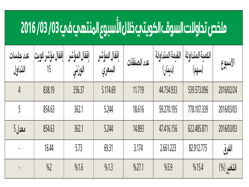 لم تكن نسبة 1.3% الخضراء هي المؤشر لتعاملات سوق الكويت للأوراق المالية التي حققها مؤشره السعري والذي أقفل رابحاً 69.31 نقطة، ومقفلا على مستوى 5244 نقطة، وكانت هناك تطورات إيجابية أكثر بكثير من النسبة المذكورة آنفاً، حيث حقق مؤشر كويت 15 نسبة 2% كما ربح «الوزني» ٦.١٪.