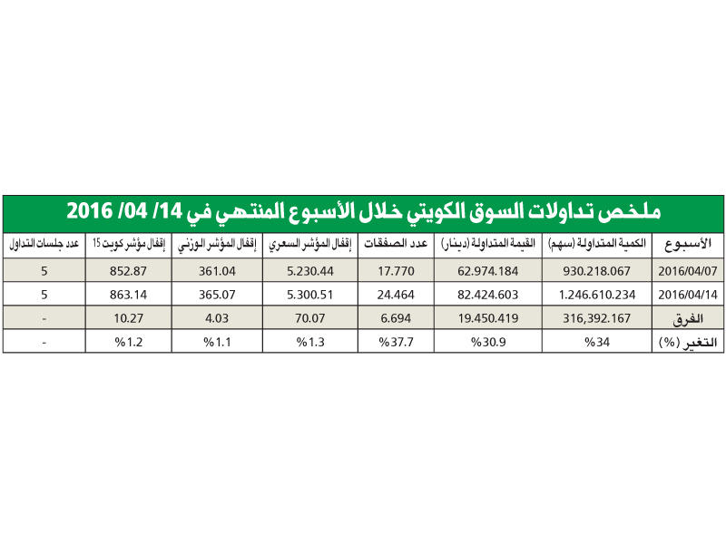 سجلت مؤشرات سوق الكويت للأوراق المالية نمواً جيداً بنهاية أسبوعها الماضي، وحقق «السعري» ارتفاعاً بنسبة 1.3 في المئة تعادل 70.07 نقطة، ليقفل على مستوى 5300.51 نقطة، بينما ربح «الوزني» نسبة 1.1 في المئة، وسجل «كويت 15» نمواً أكبر قليلاً وبنسبة 1.2 في المئة.