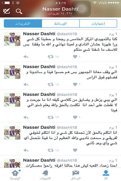 وجه لاعب الفريق الأول للكرة الطائرة بنادي القادسية "الليبرو" ناصر عبدالصمد انتقادات لاذعة إلى مجلس إدارة النادي ورئيسه الشيخ خالد الفهد بسبب معاناة الفريق منذ فترة طويلة وعدم الإيفاء بالوعود التي يقطعها القائمون على إدارة النادي كل عام بدون تنفيذ.وكتب عبدالصمد في حسابه الشخصي على موقع التواصل الاجتماعي "تويتر" عدة تغريدات حملت اتهمات ضمنية لرئيس وأعضاء مجلس إدارة النادي بإهمال الفريق، وقال "إلى متى مهمشين فريقنا يابوفهد كل سنة نأخذ وعود وما نشوف شيء، لا أحد يعلم شيء عن الفريق ولا في تعاون، مرينا بظروف تعيسة، وتحملنا الإصابات ولم نر شيء ولا حتى تكريم ولا تحفيز للفريق".
