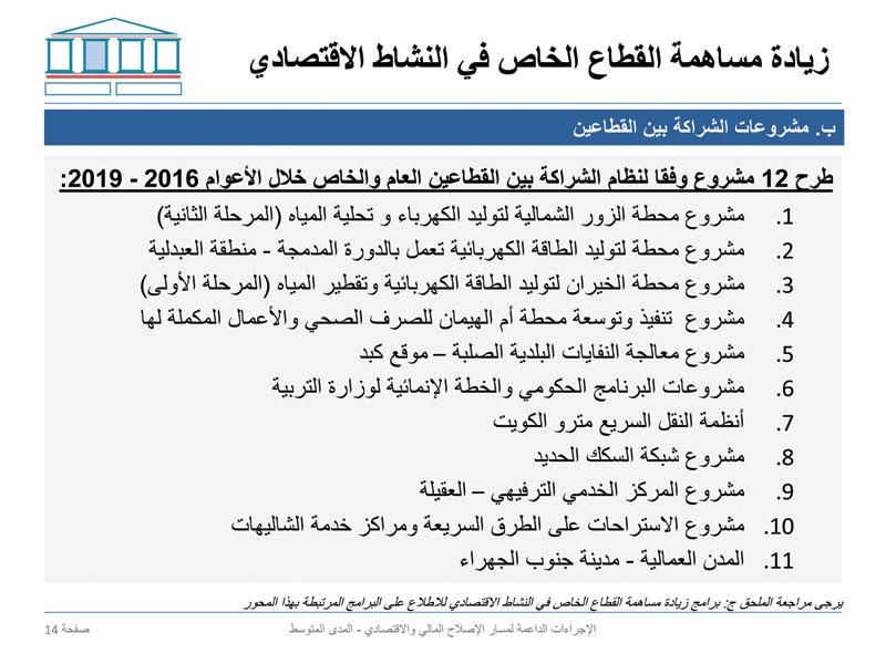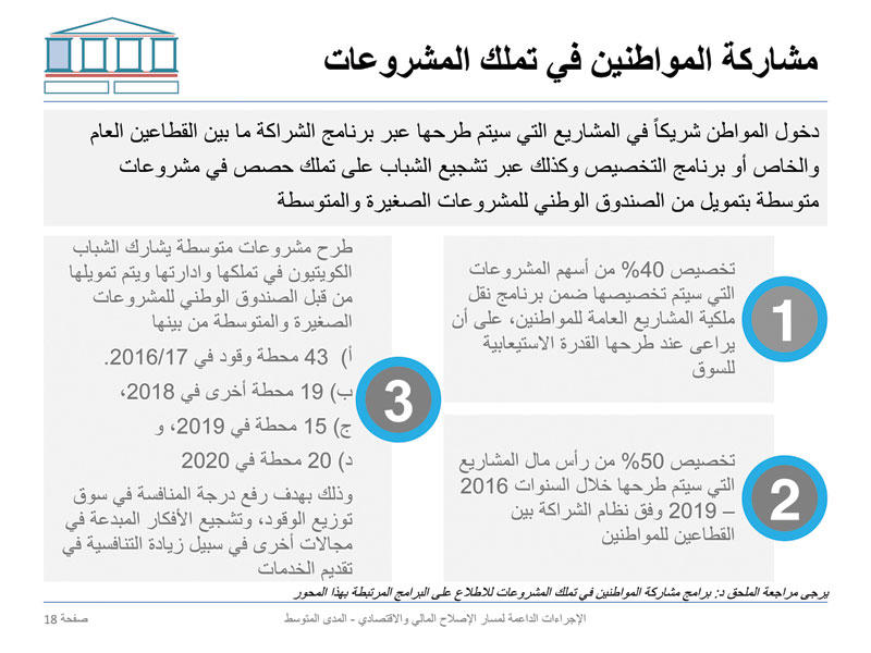 قال الصالح إن المواطنين سيتملكون 2.728 مليار دينار عن طريق مساهمتهم في مشاريع الشراكة بين القطاعين العام والخاص الواردة في الوثيقة، موضحاً أن الهدف من هذه الخطوة إشراكهم في اتخاذ القرارات الاقتصادية.