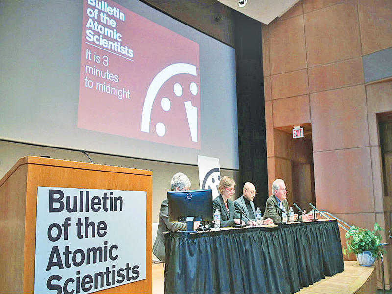 وقالت المجموعة، التي أنشأت تلك الساعة الرمزية، في فجر العصر النووي قبل عقود، إن الدقائق الثلاث هي الأقرب إلى منتصف الليل منذ عام 1983، عندما كان سباق التسلح في ذروته بين أكبر قوتين نوويتين، الولايات المتحدة والاتحاد السوفييتي.وكان العلماء حركوا عقرب الدقائق، من خمس إلى ثلاث دقائق العام الماضي، مبدين خشيتهم ليس تجاه الأسلحة النووية فحسب، بل أيضاً بسبب التغير المناخي. وقال العلماء، في بيان صحافي، إن ارتفاع حرارة الكوكب تهدد الحياة على الأرض، كما هي الحال بالنسبة للأسلحة النووية.وذكروا أنه على الرغم من نجاح اتفاق باريس بشأن المناخ، فإن الترسانات النووية الحالية وبرامج تحديثها تزيد مخاطر اندلاع حرب نووية.وكانت نشرة علماء الذرة أنشأت "ساعة القيامة"، بعد عامين من إلقاء الولايات المتحدة قنابل ذرية على اليابان عام 1945؛ لتنتهي الحرب العالمية الأولى نهاية مفاجئة.ويجتمع العلماء كل عامين لتحديد ما إذا كان ينبغي تحريك عقرب الدقائق، وكان العقرب يبعد خمس دقائق عن النهاية الرمزية للكوكب في منتصف الليل بهذه الساعة عام 2012، قبل أن يتم تغييره إلى ثلاث دقائق العام الماضي.(أ ف ب)