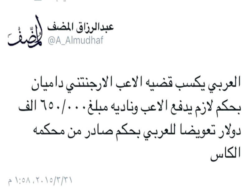 النادي خسر قضيته مع الأرجنتيني داميان رغم إعلانه كسبها سابقاً