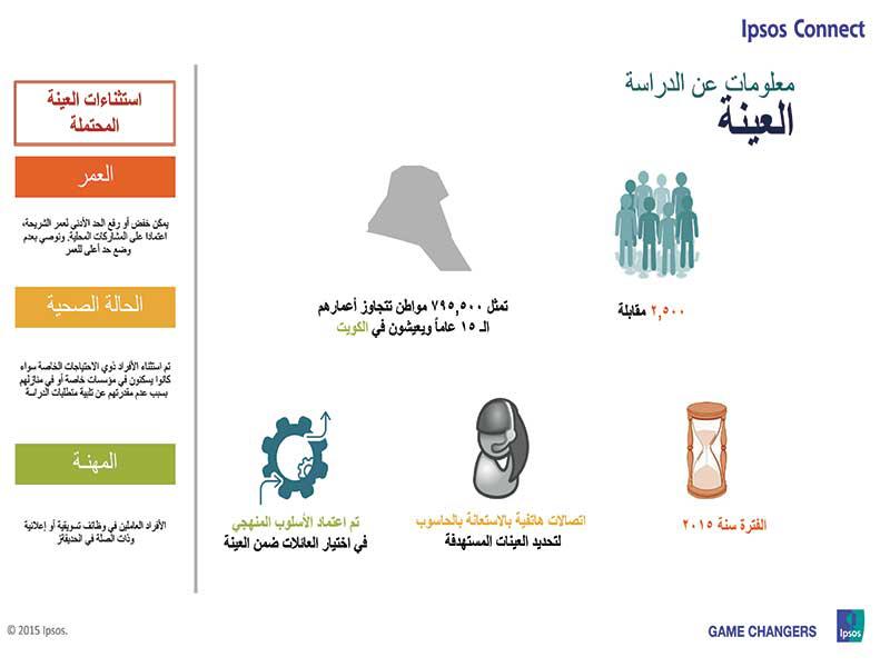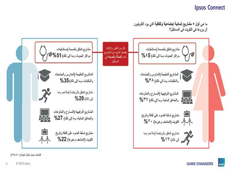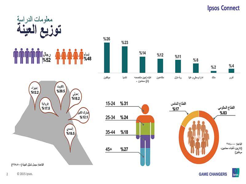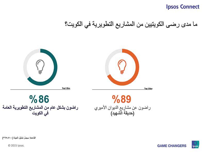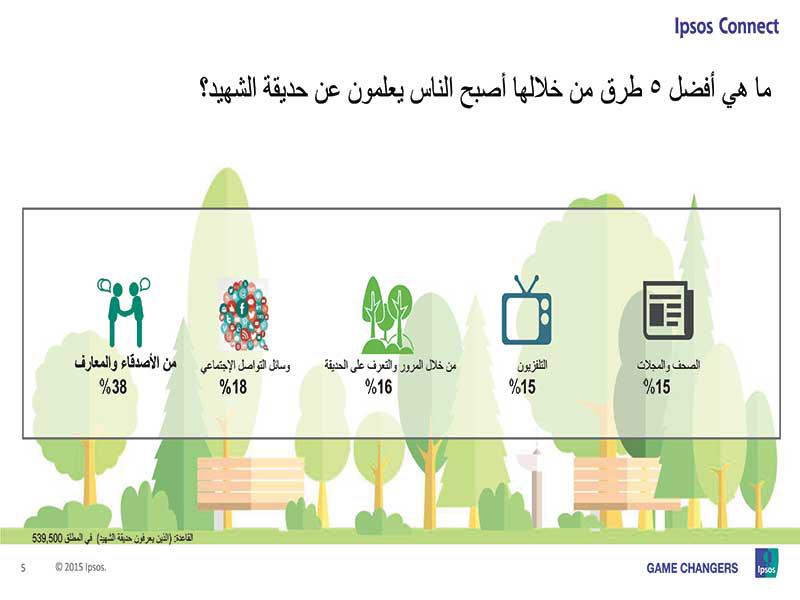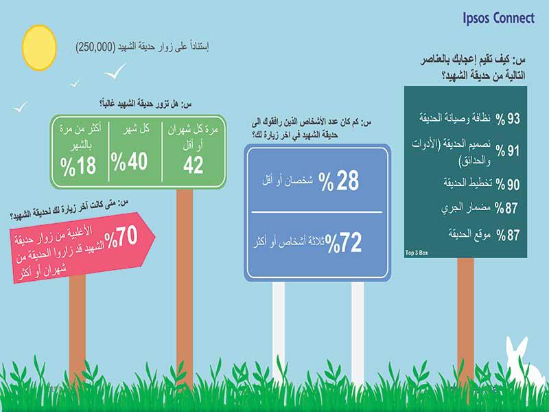 الأهدافوللوقوف على أهمية هكذا مشاريع إنمائية، تم تكليف شركة إبسوس العالمية لإجراء دراسة عن المشاريع الإنمائية المختلفة (المنجزة أو قيد الإنشاء) في الكويت أولا» لمعرفة مقدار الرضا عنها وقبولها، وبالتالي تمكيننا من الاطلاع على مستوى الوعي والإدراك في المجتمع، والهدف الثاني كان لتحديد نوعية المشاريع التي يتطلع المواطنون الكويتيون إلى رؤيتها في المستقبل القريب. بالإضافة إلى أهداف أساسية أخرى منها قياس مدى معرفة وإدراك المجتمع بحديقة الشهيد وشرائح الزوار الذين يستخدمون هذا المرفق المميز. وقد اعتمدت إبسوس كونكت (Ipsos Connect) المتخصصة في مجال تواصل وسائل الإعلام والعلامات التجارية والمستهلكين في دراستها الشاملة هذه على الأسلوب القياسي في تجميع البيانات.فترة الدراسة سنة: 2015الشريحة المستهدفة 2.500 شخص من المواطنين الذين تتجاوز أعمارهم 15 سنة ويعيشون في الكويت، والتي تمثل 795.500وقد توزعت العينة وفقأ للرسم الموضححديقة الشهيد في سطوربناء على رغبة أميرية سامية، تم تطوير حديقة الشهيد المعروفة سابقا» باسم حديقة الحزام الأخضر من قبل الديوان الأميري، وهي من أكبر الحدائق العامة في دولة الكويت، والواقعة في قلب منطقة شرق، لتصبح مكانا خاصا لتكريم وتخليد ذكرى شهداء الكويت الأبرار، ولتكون متنزها طبيعيا تنتشر في أرجائه مواقع ثقافية وتعليمية وترفيهية. وفي يوم 2 من شهر مارس من العام المنصرم، قام سمو أمير البلاد الشيخ صباح الأحمد الجابر الصباح، وسمو ولي العهد الشيخ نواف الأحمد الجابر الصباح، بافتتاح العمل على مشروع تطوير الحديقة.في الحديقة العديد من المرافق والمباني والمسطحات الخضراء، ولعل ما يميزها، ويجعل منها حديقة فريدة في الخليج والشرق الأوسط هو أن سقوف وجدران مبانيها الخارجية مكسوة بالنباتات الخضراء، مما جعل منها تلالا خضراء تشبه من الخارج الحدائق المعلقة. وبذلك تحولت منشآت الحديقة إلى مساحات خضراء وإلى نسيج نباتي معماري فريد من نوعه يجعل الهواء أكثر نقاء. هذه المرافق جزء مهم وأساسي من المشروع مخصص ليضم الأنشطة التفاعلية داخل الحديقة. وتربط مكوناتها الداخلية بين أصالة الماضي وتطور الحاضر بحيث يرى فيها الزائر ماضيه الشعبي والشرقي القديم وحاضره المشرف على حد سواء. وهذه المرافق مزودة بأحدث التقنيات ووسائل العرض، لكل مرفق منها عدد من الملحقات والمكونات التي لا يضاهيها مثيل في الدول العربية. من هذه المرافق: مجمع الذكرى، نصب الشهيد، ساحة الاحتفالات، بحيرة الحزام الأخضر، ساحة العلم، مبنى الإدارة، مركز الزوار ونصب الدستور. نتائج الدراسةجاءت نتائج الدراسة لتظهر مقدار معرفة الكويتيين بحديقة الشهيد التي تميزت واحتلت موقع الصدارة، محققة أعلى مستوى معرفة بين جميع المشاريع الإنمائية الحديثة بما يعادل أكثر من نصف مليون يليها مشروع مستشفى جابر الأحمد الجابر الصباح، وحل ثالثا مشروع توسيع المستشفى الأميري.وقد أظهرت الدراسة مستوى رضا عال للمواطنين عن مشروع حديقة الشهيد بنسبة 89 في المئة. إضافة أيضا إلى مستوى رضا مرتفع عن مشاريع التنمية والتطوير المختلفة داخل الكويت وبنسة 86 في المئة. وجاءت على النحو التالي: وبينما احتلت المشاريع الإنمائية الصحية سلم أولويات ما يتطلع إليه المواطنون والمواطنات من مشاريع مستقبلية تليها مشاريع التطوير التربوية، فإن المشاريع الثقافية التي تشمل تطوير المتاحف والمنتزهات والحدائق العامة كانت من ضمن ما اختاره الذكور والإناث ضمن الاهتمامات الخمسة الأولى يضاف إليها المشاريع الإنمائية، الرياضية والترفيهية. وعندما تم السؤال عن مدى معرفة الشريحة المستهدفة في الدراسة عن حديقة الشهيد وكيفة معرفتهم بها، أجاب 38 في المئة أنهم سمعوا عنها عن طريق الأصدقاء والمعارف، بينما 18 في المئة عبر وسائل التواصل الاجتماعي، وأجاب 16 في المئة بمجرد مرورهم بالقرب من موقع الحديقة، و15 في المئة منهم من خلال التلفاز، وبالنسبة ذاتها من خلال قراءتهم للصحف والمجلات. لمحة سريعة
