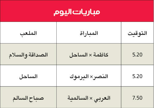 يلتقي اليوم كاظمة مع الساحل في الساعة 5:20، وفي التوقيت ذاته يلعب النصر مع اليرموك، في حين يواجه العربي السالمية، وذلك في افتتاح الجولة الـ 23 لدوري ڤيڤا لكرة القدم.
