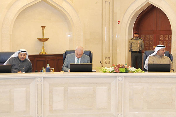 عقد مجلس الوزراء اجتماعه الأسبوعي بعد ظهر اليوم الاثنين في قاعة مجلس الوزراء بقصر السيف برئاسة سمو الشيخ جابر مبارك الحمد الصباح رئيس مجلس الوزراء وبعد الاجتماع صرح وزير الدولة لشؤون مجلس الوزراء ووزير الكهرباء والماء بالوكالة الشيخ محمد عبد الله مبارك الصباح بما يلي: أحيط مجلس الوزراء علما بالأمر السامي لحضرة صاحب السمو الأمير حفظه الله ورعاه بترشيد وتخفيض ميزانية الديوان الأميري والجهات التابعة له منوها بما تمثله هذه المبادرة السامية من رسالة جامعة تستشعر بروح المسؤولية ما تتعرض له موارد الدولة نتيجة استمرار انخفاض أسعار النفط وما تستوجبه من تداعي الجميع أفرادا ومؤسسات لمواجهة هذا التحدي وتجاوز آثاره ونتائجه.وقد حث سمو رئيس مجلس الوزراء نائب رئيس مجلس الوزراء ووزير المالية ووزير النفط بالوكالة بالتنسيق مع كافة الجهات الحكومية لاتخاذ ما يلزم من خطوات واجراءات تترجم التوجيهات السامية وترشيد الانفاق العام بما ينسجم مع متطلبات الظروف الراهنة ويحقق المصلحة العامة التي يحرص الجميع على الالتزام بها.