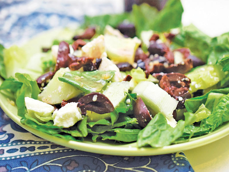 يضفي الزعفران على الأطباق نكهة مميزة عطرة. أما إذا لم يتوافر لديك، فيمكنك استعمال الكركم أو خلطة Bijol.افتحي كيساً من السلطة المغسولة والجاهزة للأكل وقدميه مع صلصة السلطة المفضلة لديك. وهكذا تحصلين على وجبة طعام كاملة.يمكنك استعمال خليطاً من الخضراوات، مثل الفاصولياء الخضراء أو البازيلاء.المقادير:• كوب من مرق الدجاج الخالي من الدهون والقليل الملح.كوب من الماء.• ربع ملعقة صغيرة من الزعفران.• كوب من البصل المثلج المقطع.• كوب من الكوسا المقطعة إلى شرائح.• 56 غراماً من النقانق الإسبانية المقطعة إلى مكعبات (نحو نصف كوب).• ثلثا كوب من الأورزو.• 225 غراماً من الهليون المقطع إلى قطع صغيرة (نحو كوب ونصف الكوب).• كوب من البازيلاء المثلجة.• نصف كوب من الفلفل الأحمر المحمر، المصفى، والمقطع إلى شرائح.• ملح وفلفل أسود مطحون طازج.الطريقة: • ضعي مرق الدجاج، الماء، والزعفران في مقلاة متوسطة الحجم غير قابلة للالتصاق واتركيها على النار لتغلي.• أضيفي البصل، الكوسا، النقانق، والأورزو إلى المقلاة.• حركي الخليط واتركيه ليغلي من جديد واطهيه مدة 5 دقائق (إن لم تستخدمي مقلاة غير قابلة للالتصاق، حركي الخليط باستمرار للحؤول دون التصاقه). أما إذا جف الخليط، فأضيفي المزيد من المرق.• أضيفي الهليون، البازيلاء، والفلفل الأحمر المحمر، وواصلي الطهو لثلاث دقائق إضافية. طيبي الخليط بالملح والفلفل حسب الذوق.• في الحصة: 439 سعرة حرارية (26% منها من الدهون)، 12.5 غراماً من الدهون (4.4 غرامات من الدهون المشبعة و5.4 غرامات من الدهون غير المشبعة)، 25 مليغراماً من الكولسترول، 20.9 غراماً من البروتين، 62.4 غراماً من النشويات، 8.1 غرامات من الألياف، و370 مليغراماً من الصوديوم.سلطة الزيتون والخسالمقادير:• 4 أكواب من الخس المغسول والجاهز للأكل.• 8 حبات من الزيتون الأسود المنزوع النواة.• ملعقتان كبيرتان من الصلصة القليلة الدسم.الطريقة:• ضعي الخس في وعاء وأضيفي إليه الزيتون وقلبيهما مع الصلصة.• في الحصة: 47 سعرة حرارية (60% منها من الدهون)، 3.1 غرامات من الدهون (0.4 غرام الدهون المشبعة و1.7 غرام من الدهون غير المشبعة)، مليغرام من الكولسترول، 1.4 غرام من البروتين، 4.9 غرامات من النشويات، 2.4 غرام من الألياف، و140 مليغراماً من الصوديوم.