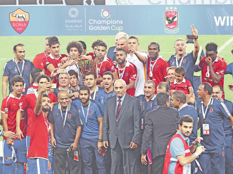 حقق الأهلي فوزا تاريخيا على نظيره روما الإيطالي بأربعة أهداف مقابل ثلاثة، مساء أمس الأول الجمعة، في المباراة الودية التي أقيمت على ملعب هزاع بن زايد بمدينة العين الإماراتية، وسجل للمارد الأحمر الغاني جون أنطوي ومؤمن زكريا ووليد سليمان وأحمد الشيخ، في حين أحرز لروما إيدين دجيكو ومحمد صلاح وويليام فانكيير.بدأ اللقاء بحماس شديد من جانب لاعبي الأهلي أملاً في خطف هدف مبكر، ونجح روما في احتواء هذا الحماس بفرصة مؤكدة عبر دجيكو ثم كرة أخرى أبعدها الحارس شريف إكرامي، وفي الدقيقة 15، سجل الأحمر هدف التقدم عبر المهاجم الغاني جون أنطوي بعدما تسلم تمريرة من مؤمن زكريا الذي قطع الكرة من دفاع روما.وحرم القائم المهاجم دجيكو من هدف محقق ثم كرة أخرى أبعدها إكرامي من تسديدة محمد صلاح قبل أن ينجح دجيكو في تسجيل هدف التعادل بالدقيقة 20.وحاول روما الوصول من جديد لمرمى الأهلي مع محاولة من صلاح وتسديدة عبر خطأ على حدود منطقة الجزاء ردها الدفاع، وبالفعل نجح صلاح في تسجيل هدف التقدم في الدقيقة 40 من تسديدة رائعة على حدود منطقة الجزاء من تمريرة لدجيكو، لكن الأحمر رد سريعا عبر مؤمن زكريا من تمريرة لصالح جمعة قابلها بتسديدة رائعة في مرمى روما في الدقيقة 42 لينتهي الشوط الأول بالتعادل بهدفين لكل منهما.