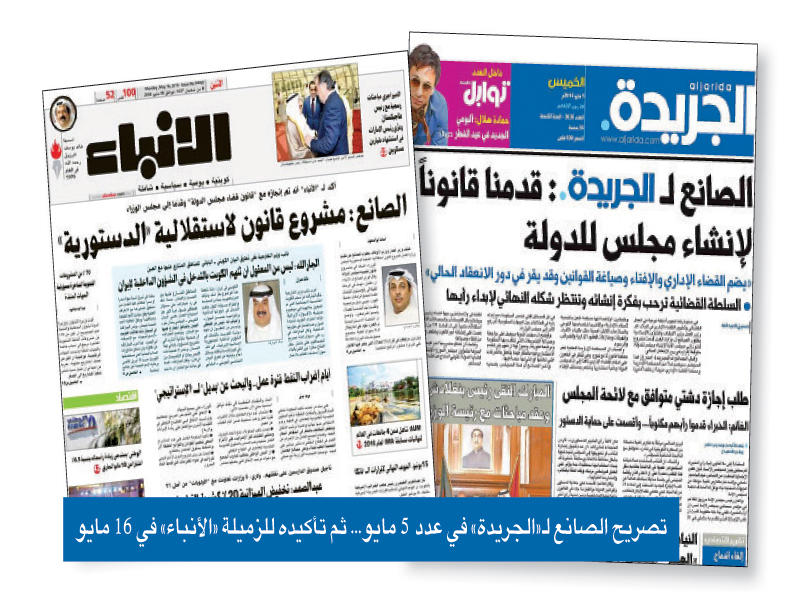 وهو نفس الخبر الذي صرح به للزميلة «الأنباء» في ١٧ الجاري، مؤكداً فيه إحالة مشروعي مجلس الدولة وتعديلات المحكمة الدستورية إلى مجلس الوزراء!ولم يأتِ أي توضيح أو تعليق من الصانع خلال الأسبوعين الماضيين، ما يؤكد صحة الخبر وسلامة معلوماته التي وردت على لسان الوزير نفسه سواء لـ»الجريدة» أو لـ»الأنباء»، غير أن الرفض النيابي والسياسي والشعبي لـ»قوانين يعقوب» جعله يتراجع بشكل يكشف الأزمة التي وضع نفسه فيها.والآن يبقى السؤال الأهم: من نصدق؟ إعلان الوزير تقديم مشروع القانون إلى مجلس الأمة؟ أو تصريحه للزميلة «الأنباء» بإحالته إلى مجلس الوزراء؟ أو تصريحه أمس بأن جهات «الفتوى» و»القانونية الوزارية» والسلطة القضائية ومجلس الوزراء لم تنتهِ منه؟