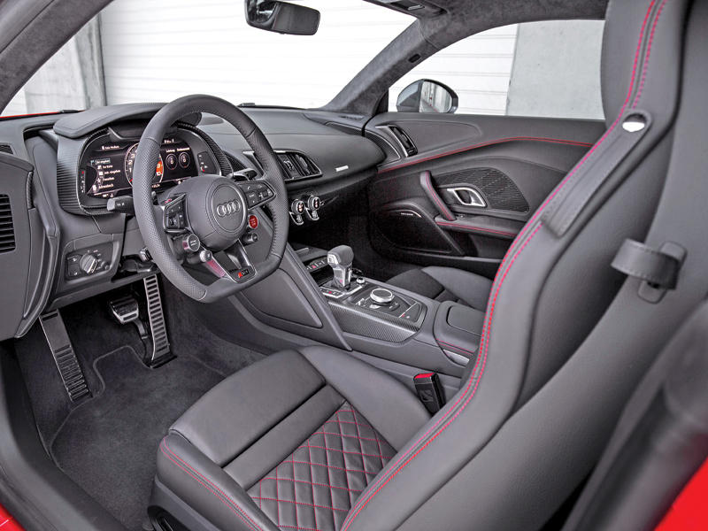 ومثل أي محرك آخر لسيارة سباق، يمتلك محرك R8 نظام حوض التشحيم الجاف، ما يمنح الصوت طابعاً خاصاً أكثر قوة، فيما يمكن تركيب نظام العادم الرياضي كخيار. وتم تحسين نظام الحد من استهلاك الوقود بنسبة تصل إلى 13 في المئة في السلسلة R8، مقارنة بالنموذج السابق.وبالنسبة لمجموعة الدفع والحركة، يتم تبديل الحركة لنظام S tronic سباعي السرعة بشكل سريع باستخدام قابض مزدوج، وقفل تفاضلي ميكانيكي معدل، ومقبض جديد متعدد الصفائح يتم تفعيله بطريقة إلكتروهيدروليكية. ويعمل نظام الدفع الرباعي، والذي يمكن تبريده بشكل فاعل، على توزيع عزم القوة بحرية بين محاور السيارة. ويتكامل نظام التحكم الديناميكي الذكي لنظام الدفع الرباعي quattro في نظام التحكم الديناميكي "أودي درايف سيلكت"، الذي يتيح أربعة أنماط أساسية.وفي كل نمط، تكشف السيارة الرياضية الجديدة ذات الأداء الرفيع عن شخصية مختلفة، من سيارة مميزة للقيادة على الطرق السريعة إلى سيارة سباق قوية على حلبات السباق. وفي نموذج R8 V10 plus تعد عجلة القيادة المميزة المكسوة بالجلد سمة قياسية. وفي نمط الأداء هذا، تتيح السيارة ثلاثة أنماط إضافية جديدة للطرق الجافة والرطبة والثلوج. وأصبح التحكم أكثر دقة ووضوحاً وقدرة على الضبط، وفق معامل احتكاك سطح الطريق المحدد. وتتوافر التقنية الجديدة أيضاً في R8 V10، بما في ذلك عجلة القيادة التي تستخدم لاختيار الأنماط الخاصة.ألمنيوم وكربون يصل الوزن الصافي لسيارة R8 V10 plus إلى 1454 كيلوغراما فقط. ويعود ذلك في المقام الأول إلى التصور الجديد الخاص بإنتاج هيكل أودي المصنوع من مواد متعددة، والذي يتكون من الألمنيوم وقطع من ألياف الكربون. ولا يتجاوز وزن هيكل أودي 200 كيلوغرام فقط. ويمتاز الهيكل السفلي من السيارة بغطاء ناعم، كما هي الحال في سيارات السباق، ووضعت مخارج تدفق الهواء عبر ناشر كبير، وهذا يعزز القوة الضاغطة للسيارة.وفي سرعتها القصوى، يصل الوزن إلى 40 كيلوغراما عند المحور الأمامي، و100 كيلوغرام عند المحور الخلفي. ويلعب الجناح الخلفي الكبير المصنوع من ألياف الكربون دوراً مهماً في تحقيق هذه الأرقام المميزة.تصميم حصريوكما هي الحال في أي سيارة سباق، تركز المقصورة الداخلية للسيارة الرياضية عالية الأداء على السائق. ويستطيع السائق قراءة جميع المعلومات الأساسية من مقصورة "أودي" الافتراضية. وتتوضع عجلة القيادة، ولوحة العدادات والطريق بوضوح على طول محور مركزي واحد. ويمكن للسائقين تشغيل جميع الوظائف الأساسية باستخدام أزرار ضغط متعددة الوظائف دون الحاجة لإبعاد أيديهم عن عجلة القيادة، أو صرف نظرهم عن الطريق.وتمتاز مقصورة أودي الافتراضية، بكونها قابلة للضبط عبر المستخدم، وتظهر الشاشات كافة في رسومات غرافيكية متقنة ثلاثية الأبعاد، وفق الرغبة، مع عداد دوران محرك كبير وأجهزة قياس مساعدة تظهر مزيداً من المعلومات، مثل درجة حرارة الإطارات وعزم الدوران الناتج. ويعد نظام الملاحة MMI المعزز "بلاس" مع شاشة الوسائط المتعددة التي تعمل باللمس سمة قياسية في سيارة R8 الجديدة. وتم تصميم مركز الوسائط المتميز هذا بما ينسجم مع منطق بساطة التشغيل. R8 LMS الإتقان الذي تمتاز به R8 الجديدة - والذي يتم يدوياً في مصنع جديد بالقرب من نيكارسولم - سمة لا مثيل لها. وتمتد مجموعة مكوناتها التكنولوجية الاختيارية إلى نظام الصوت من "بانج آند أولفسن" وتقنية الليزر من أودي، والتي تضاعف مجموعة إضاءة الشعاع العالي. وتتمتع R8 الجديدة بسمات تجعلها شديدة الشبه بسيارات السباق، وهي ميزة لم تسبقها إليها أي سيارة أودي أخرى. ويبدو ذلك جلياً عبر نماذج مشابهة لها مثل - سيارة السباق "جي تي 3" الجديدة، R8 LMS. وللمرة الأولى، طورت أودي النماذج الثلاثة في وقت واحد، بهدف تحقيق الحد الأعلى من التآزر. وحققت R8 الجديدة ونظيرتها الرياضية R8 LMS مكاسب كبيرة في الأداء، بفضل التعاون الوثيق بين المهندسين ومتخصصي سيارات السباق ومطوري الأداء. وبعد عشرة أسابيع فقط من عرضها العالمي الأول في "معرض جنيف للسيار