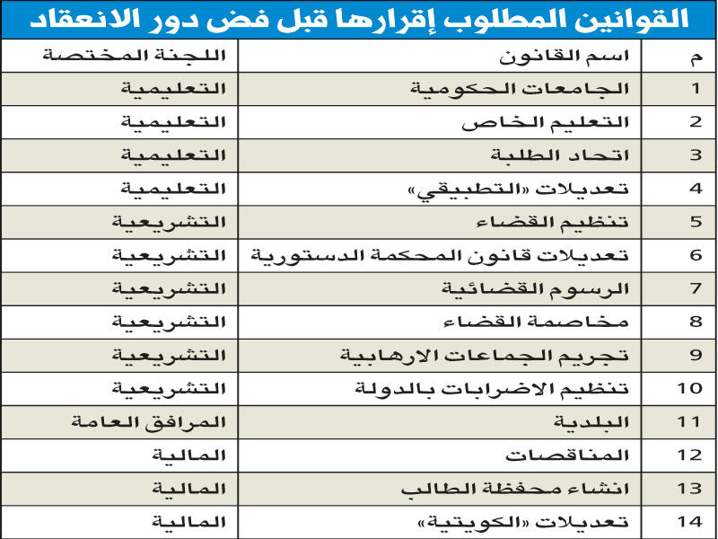 انتهى اجتماع رؤساء اللجان البرلمانية مع رئيس مجلس الأمة مرزوق الغانم إلى الاتفاق على إنجاز القوانين المطلوبة من قبل لجنة الاولويات قبل فض دور الانعقاد الحالي، كما تم خلاله تحديد موعد جلسات مناقشة ميزانيات الجهات الحكومية التي ستكون في رمضان، إذ ستبدأ من 13 حتى 16 يونيو.وأعلن رئيس لجنة الاولويات البرلمانية النائب د. يوسف الزلزلة عن اجتماع عقده مكتب المجلس برئاسة الغانم وحضور رؤساء اللجان الدائمة، لمناقشة «أوجه القصور» التي حدثت في بعض اللجان، والقوانين المفترض إقرارها قبل فض دور الانعقاد الجاري.تقارير شهريةوقال الزلزلة، في تصريح صحافي، إنه بعد النقاش المستفيض تم الاتفاق على تكليف لجنة الاولويات بمتابعة جميع اللجان ومدى إنجازها تقاريرها، وان تقوم لجنة الاولويات بإحالة تقارير شهرية إلى المجلس حول أعمال اللجان، للتأكد من قيامها بدورها على النحو المطلوب.وأوضح أنه تم الاتفاق على أن يناقش المجلس ميزانيات الجهات المستقلة والملحقة في جلسات خاصة تعقد من 13 حتى 16 يونيو المقبل، على أن يتم لاحقا تحديد موعد مناقشة الميزانية العامة للدولة.وأضاف أن التشريعات التي تخص اللجنة التعليمية، وتم الاتفاق على إقرارها في دور الانعقاد الجاري، هي الجامعات الحكومية والتعليم الخاص واتحاد الطلبة وتعديل قانون التطبيقي، مشيرا الى أن التشريعات التي تخص اللجنة التشريعية هي قوانين تنظيم القضاء والمحكمة الدستورية والرسوم القضائية ومخاصمة القضاء، وكذلك تجريم الجماعات الارهابية وتنظيم الاضرابات في الدولة.وأشار إلى أن قانون البلدية من القوانين ذات الاولوية، حيث أحالته لجنة المرافق إلى المجلس، كما تم الاتفاق على أن تقدم اللجنة المالية قوانين المناقصات ومحفظة الطالب والخطوط الكويتية، وسيتم تخصيص الجلسة العادية المقرر عقدها في 9 يونيو المقبل لقوانين القضاء الأربعة، مضيفا ان الحكومة وعدت بإحالة هذه القوانين إلى المجلس الأسبوع الجاري.المناقصات العامةوفي تصريح لـ«الجريدة»، قال رئيس لجنة الشؤون المالية والاقتصادية البرلمانية النائب فيصل الشايع إن هناك عدة قوانين تعمل اللجنة على انجازها قبل فض دور الانعقاد الحالي، على رأسها قانون المناقصات العامة في حلته الجديدة، مشيرا الى ان تقرير اللجنة شبه جاهز وهو في مرحلة المراجعة اللغوية، متوقعا ان تتم مناقشته في جلسة 24 الجاري.وأضاف الشايع ان اللجنة وجهت الدعوة الى نائب رئيس الوزراء وزير المالية وزير النفط بالوكالة انس الصالح، ووزير التربية وزير التعليم العالي بدر العيسى، لمناقشة مشروع القانون المقدم من الحكومة بشأن تأسيس محفظة استثمارية لدعم وتشجيع الطلبة الدارسين على نفقتهم الخاصة، والذي تنوي اللجنة انجازه قبل نهاية دور الانعقاد الحالي.واشار الى انه تم ترتيب جدول أعمال الجلسات المقبلة في اجتماع أمس، بناء على المشاريع المتوقع انتهاؤها من اللجان البرلمانية. من جهته، قال رئيس لجنة الشؤون الخارجية البرلمانية النائب كامل العوضي إن اجتماع أمس جاء انطلاقا من حرص رئيس مجلس الأمة مرزوق الغانم الدائم على حث اللجان البرلمانية على إنجاز المواضيع المدرجة على جدول أعمالها، مشيرا الى ان هذه الاجتماعات المتكررة التي يعقدها الغانم تساهم في تحريك عجلة الانجاز داخل اللجان البرلمانية.وأضاف العوضي: «ان الغانم حث رؤساء اللجان على ضرورة الإسراع في إنجاز القوانين الموجودة، بعد أن استمع الى كل واحد منهم عن سبب تأخرها»، مشيرا الى انه بصفته رئيس اللجنة الخارجية عرض الاتفاقيات المدرجة على جدول اعمال اللجنة، والتي تنوي إنجازها، وتم الاتفاق على ان يجتمع رؤساء اللجان مع لجنة الاولويات الاسبوع المقبل لمتابعة ما تم الاتفاق عليه في اجتماعهم مع الرئيس الغانم.اجتماع «الصحية»على صعيد آخر، ناقشت لجنة الشؤون الصحية والاجتماعية والعمل البرلمانية، خلال اجتماعها أمس، التعديلات المقدمة على القانون رقم 6 لسنة 2010 بشأن العمل في القطاع الاهلي، بحضور ممثلين عن وزا
