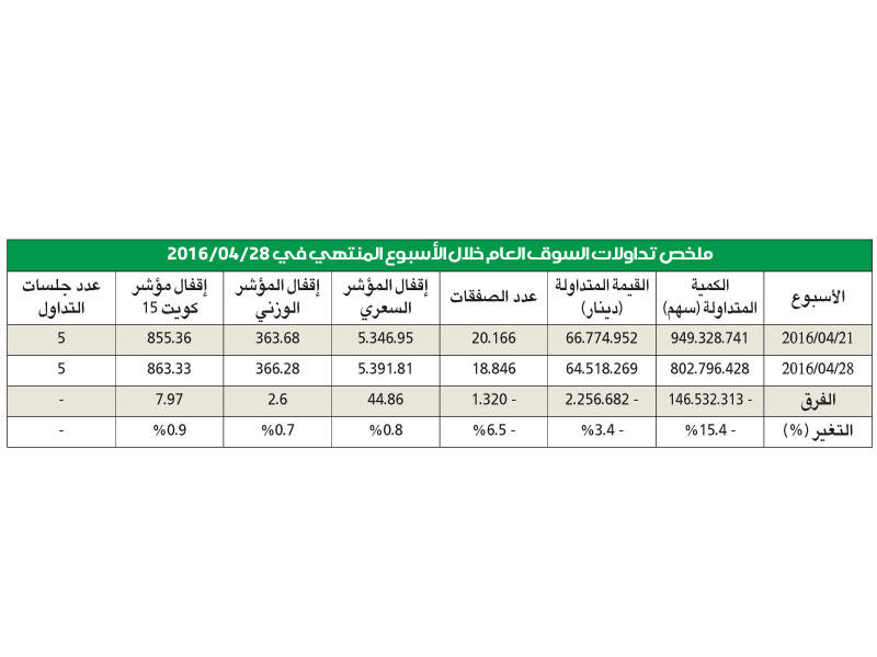 استطاعت مؤشرات سوق الكويت للأوراق المالية الرئيسية تسجيل محصلة إيجابية بنهاية تعاملات الأسبوع الأخير من الشهر، رغم ما تعرضت له من تراجع خلال الجلسة الأخيرة خصوصاً المؤشر السعري الذي أقفل رابحاً نسبة 0.8 في المئة، وربح الوزني كذلك نسبة 0.7 في المئة، بينما زادت مكاسب كويت 15 بنسبة محدودة حيث كانت 0.9 في المئة.