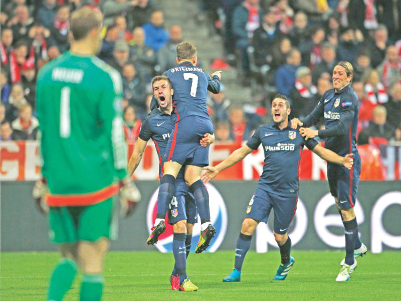 تأهل أتلتيكو مدريد إلى المباراة النهائية لدوري أبطال أوروبا لكرة القدم، رغم هزيمته على ملعب بايرن ميونيخ الألماني 2-1 في إياب الدور قبل النهائي للبطولة، لفوزه ذهاباً بهدف نظيف على ملعبه.