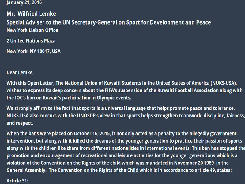 ولم ينس ايضا شباب الكويت، التأكيد على موقف وطنهم، وضرورة احترام سيادته، والقوانين الخاصة به، والتي لا تختلف بأي حال من الأحوال عن نظيرتها الدولية، وهو درس ايضا لمن حاولوا تشويه هذه القوانين من أجل مصالح ضيقة، وتصفية حسابات مع كل مخلص في هذا البلد.ويا ليت كل محب لأرض الكويت يتبع اسلوب هؤلاء الشباب، بدلاً من التواري عن المشهد، وكأن ما يحدث من سرقة لطموح الشباب، لا يعنيهم على الرغم من المسؤولية المباشرة التي في حوزتهم، كممثلين عن الاتحادات والأندية الرياضية التي مازال مسؤولوها يصرون على غض الطرف والبحث عن مخارج لهم ولاتحاد الخيبة بدلاً من محاسبته على ما تسبب فيه من حرمان وقتل لآمال الشباب الرياضيين.وفيما يلي رسالة طلبة الكويت بأميركا إلى أويلفريد ليميكي: "يود الاتحاد الوطني لطلبة الكويت فرع الولايات المتحدة الأميركية التعبير عن أسفه البالغ عن قرار الفيفا بإيقاف الاتحاد الكويتي لكرة القدم، بالإضافة الى قرار اللجنة الأولمبية الدولية بتعليق مشاركة الكويت في الفعاليات الأولمبية.ونؤكد كل التأكيد على حقيقة أن الرياضة هي لغة عالمية تساعد على دعم السلام والتسامح، كما ان الاتحاد الوطني لطلبة الكويت بالولايات المتحدة يتفق في وجهة النظر مع مكتب الأمم المتحدة المعني بشؤون الرياضة من أجل التنمية والسلام، في أن الرياضة تعمل على إرساء روح العمل الجماعي والنظام والحيادية والاحترام.وعندما صدر الإيقاف في السادس عشر من اكتوبر 2015، لم يكن فقط عقوبة على التدخل الحكومي المزعوم، لكنه جاء ليقضي على أحلام الشباب ويحرمهم المشاركة في الأنشطة الرياضية الدولية التي لطالما عشقوها بالاضافة الى احلام الكثير من الاطفال من مختلف الجنسيات، جاء هذا الايقاف ليمنع رقي وتقدم الأنشطة الترويحية والترفيهية للشباب مما يعتبر انتهاكا لميثاق حقوق الطفل الذي صدر في 20 نوفمبر 1989 في الجمعية العامة ويأتي ميثاق حقوق الطفل متفقاً مع المادة 31 والتي تنص على في فقرتها الأولى على أن تعترف الدول الأطراف بحق الطفل في الراحة ووقت الفراغ ومزاولة الألعاب وانشطة الاستجمام المناسبة لسنه والمشاركة بحرية في الحياة الثقافية وفي الفنون.كما تنص الفقرة الثانية على أن تحترم الدول الأطراف وتعزز حق الطفل في المشاركة الكاملة في الحياة الثقافية والفنية وتشجع على توفير فرص ملائمة ومتساوية للنشاط الثقافي والفني والترفيهي وأنشطة أوقات الفراغ.ومع إيماننا الراسخ بالمادة 1 والمادة 10 من الدستور الكويتي، والتي تفيد بأن الكويت دولة ذات سيادة واستقلال تكفل حماية الشباب من الاستغلال، فإننا نقف ضد هذه الإيقاف، كما اننا نؤكد ضرورة ترك أمور الحكم لمجلس الامة الكويتي والحكومة الكويتية دون اي تدخل".