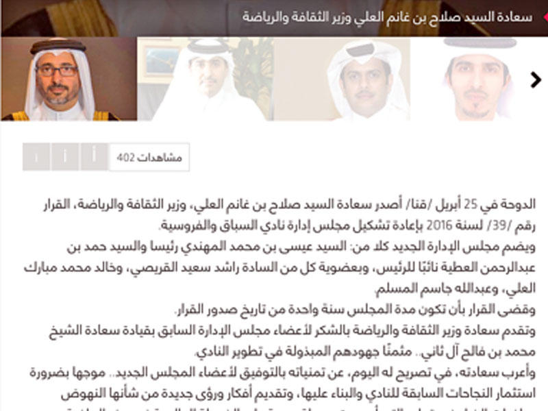 مع إطلالة كل يوم جديد على الرياضة الكويتية المنكوبة بفعل فاعل متعمد، يثبت بما لا يدع مجالا للشك سياسة الكيل بمكيالين وحجم "الحَوَلْ الإداري" التي تتعامل به اللجنة الأولمبية الدولية مع الكويت بالذات دون نظيراتها بالمنطقة على الأقل، ولن نقول العالم.ففي قرار جديد يؤكد حق الحكومات في تنظيم أوجه العمل في الهيئات الرياضية دون أن تتجرأ تلك اللجنة الموجهة على تحريك ساكن تجاه ذلك، أصدر وزير الثقافة والرياضة القطري صلاح بن غانم العلي، القرار رقم 39 لسنة 2016 بإعادة تشكيل مجلس إدارة نادي السباق والفروسية، ويضم مجلس الإدارة الجديد كلا من عيسى بن محمد المهندي (رئيسا)، وحمد بن عبدالرحمن العطية (نائبا للرئيس)، وبعضوية كل من راشد بن سعيد القريصي، وخالد بن محمد بن مبارك العلي، وعبدالله بن جاسم المسلم، وقضى القرار بأن تكون مدة المجلس سنة واحدة من تاريخ صدور القرار الذي نشرته وكالة الأنباء القطرية (قنا) يوم الاثنين 25 الجاري.