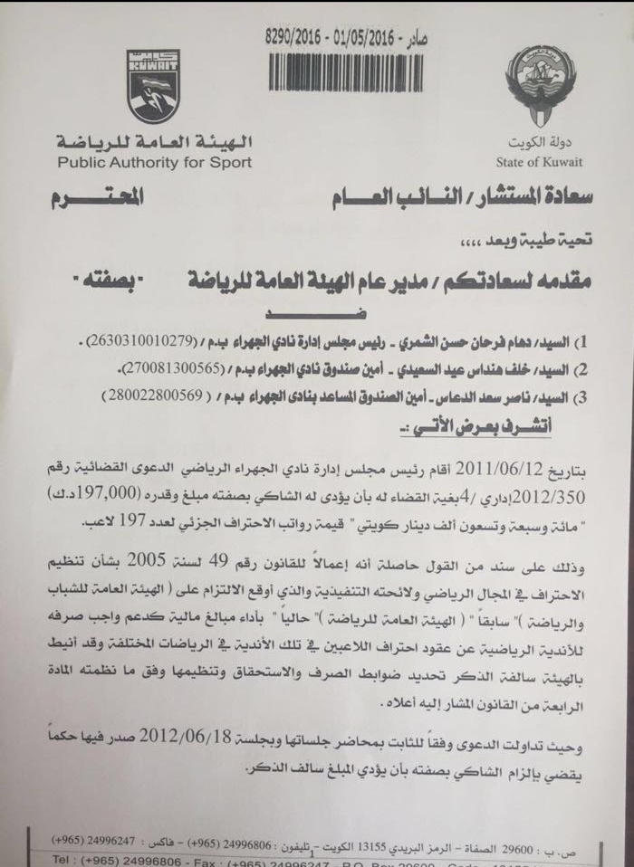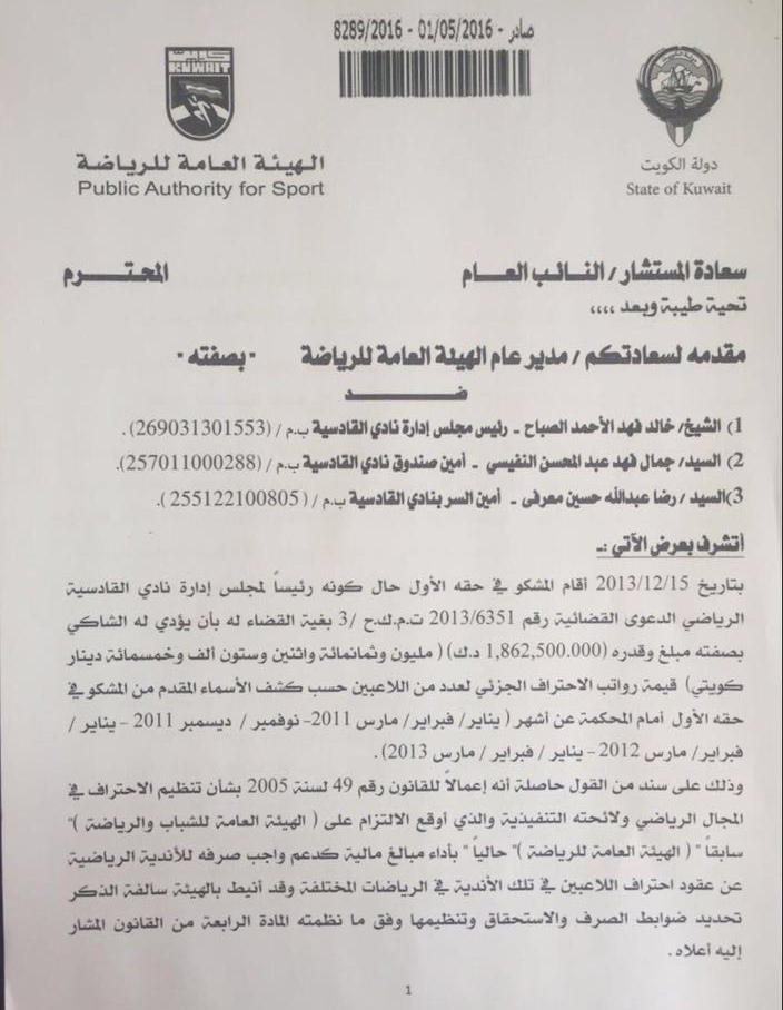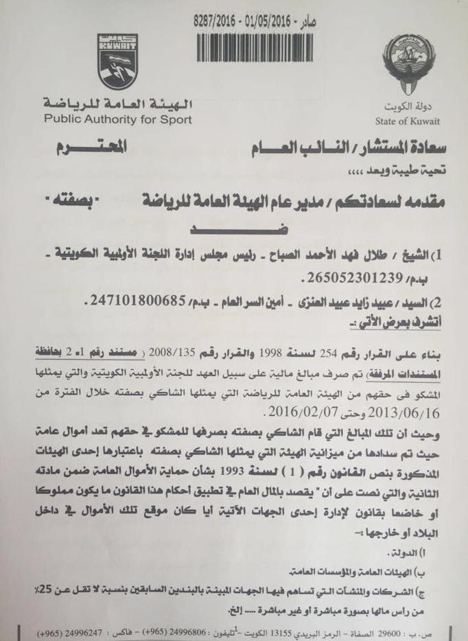 أحالت الهيئة العامة للرياضة رئيس مجلس إدارة اللجنة الأولمبية الكويتية الشيخ طلال الفهد إلى النيابة العامة بتهمة استيلاء وهدر لأموال عامة، بالإضافة إلى رئيس نادي القادسية الشيخ خالد الفهد ورئيس نادي الجهراء دهام فرحان الشمري إثر تبديد أموال الدعم والاحتراف الجزئي.