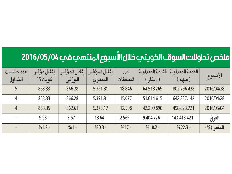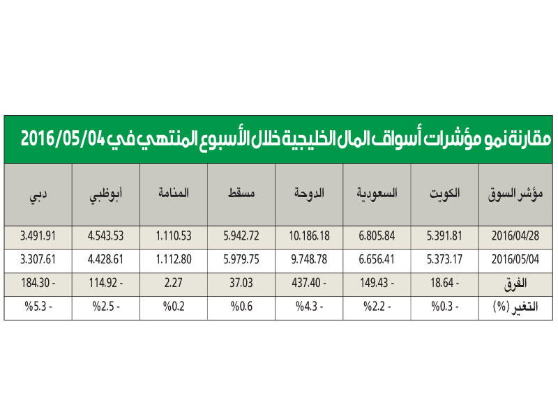كانت محصلة مؤشرات أسواق المال الخليجية خلال الأسبوع الأول من شهر مايو سلبية، وتراجع الخمسة الكبار منها بنسب متفاوتة، مال بعضها إلى تسجيل خسائر هي الأكبر خلال ثلاثة أشهر، ولم ينج من اللون الأحمر إلا سوقا مسقط والمنامة، حيث ربح الأول 0.6 في المئة، بينما ربح سوق المنامة عُشرى نقطة مئوية، وسجل مؤشر سوق دبي المالي تراجعاً حاداً بنسبة 5.3 في المئة، تلاه مؤشر سوق قطر بنسبة 4.3 في المئة، وكانت خسائر أبوظبي والسعودية وسطاً بين 2.5 و2.2 في المئة، بينما استقر مؤشر سوق الكويت «السعري» ثلث نقطة مئوية.بين النفط والنتائجفي أسبوع قصير نسبياً بسبب عطلة الإسراء والمعراج في نهاية الأسبوع لبعض الأسواق الخليجية، وقع سوقا الإمارات بين ضغط نتائج الشركات القيادية وتذبذب أسعار النفط وتراجع مؤشرات الأسواق العالمية خلال فترة عملها في أربع جلسات، كانت الأخيرة أفضلها، حيث توازن أداؤها، لكنها سجلت أكبر خسائرها الأسبوعية منذ ثلاثة أشهر، والتي تصدرها مؤشر سوق دبي المالي، حيث تراجع بنسبة كبيرة بلغت 5.3 في المئة، ليتراجع إلى مستوى 3307.61 نقاط حاذفاً 184.3 نقطة.وخسر مؤشر سوق أبوظبي نسبة 2.5 في المئة، تعادل 114.92 نقطة ليتراجع إلى مستوى 4428.61 نقطة، وتركزت خسائره خلال جلسات الأسبوع الثلاث الأولى، حيث بلغت نسبة 3.5 في المئة، غير أنه قلص منها نسبة 1 في المئة خلال جلسة يوم الأربعاء آخر جلساته الأسبوعية.مؤشر قطر يفقدمستوى 10 آلاف نقطةبعد أن حافظ عليه خلال آخر شهرين، تنازل مؤشر سوق الدوحة عن مستوى 10 آلاف نقطة وأكثر، وابتعد كثيراً حيث أقفل على مستوى 9748.78 نقطة، خاسراً نسبة 4.3 في المئة، ومتراجعاً بمقدار 437.4 نقطة، وكذلك تراجع النشاط والسيولة بنسبة 25 و30 في المئة قياساً مع الأسبوع الأخير من شهر أبريل.وانتهت 4 من جلسات الأسبوع على اللون الأحمر، وكانت المكاسب خلال أول جلسة فقط وعلى ارتفاع محدود، وكان الضغط بداية من تراجع قطاعي الصناعة والعقار، ما لبث أن زاد الضغط من بقية القطاعات لتخسر 36 شركة من مجموع 44 شركة مدرجة في سوق قطر المالي.ولم تكن ارتدادات أسعار النفط ذات أثر على مؤشر السوق خلال الأسبوع، ويبدو أنه استسلم إلى الاتجاه الهابط، وسط عمليات بيع من قبل مستمريه المحليين والأجانب على حد سواء. السعودي يتراجع 2.2 في المئةبعد أن سجل نمواً كبيرا خلال شهر أبريل الماضي، وبنسبة بلغت 8 في المئة، عاد مؤشر «تداول» السعودي وعاش مرحلة جني أرباح وتذبذب ارتبطت بتذبذب أسعار النفط، والتي حققت نمواً أكبر خلال شهر أبريل وبنسبة 20 في المئة، وهي أكبر مكاسب شهرية منذ 7 سنوات للسلعة الاستراتيجية الأولى في العالم.ووقع مؤشر «تاسي» تحت عمليات بيع وضغط أفقدته نسبت اقتربت من 3.2 في المئة خلال أول أربع جلسات، ثم ارتفع النفط خلال جلسة الأربعاء المسائية، وبفعل عاملي حريق مناطق في كندا وزيادة العنف في ليبيا، حيث التخوف من تراجع الإمدادات ليرتفع النفط على الرغم من زيادة مخزونات الخام الأميركي بوتيرة أكبر من التوقعات، مما دفع بالسوق السعودي إلى التعويض خلال جلسة الخميس لينتهي الأسبوع على محصلة سلبية بنسبة 2.2 في المئة تساوي نحو 150 نقطة، ليقفل على مستوى 6656.41 نقطة.وعلى وقع التداولات الحمراء، تراجعت السيولة إلى معدلاتها المعتدلة والقريبة من معدل هذا العام بحوالي 5 مليارات ريال، بعد ارتفاعاتها الكبيرة خلال الأسبوع الأخير من شهر أبريل، واكبتها جملة تعديلات تشريعية من قبل هيئة السوق، أهمها تغيير معدل التقاص من صفر إلى يومين، استجابة لمتطلبات انضمامها إلى مؤشر الأسواق الناشئة.تداولات صيفية مبكرةفي الكويتيسجلت مؤشرات سوق الكويت للأوراق المالية الرئيسية انخفاضاً واضحاً، وبشكل متفاوت، حيث زادت الخسارة في المؤشرات الوزنية بعد أن حقق السعري خسارة بحوالي ثلث نقطة مئوية تعادل 18.64 نقطة ليتراجع إلى مستوى 5373.17 نقطة، وزادت في المؤشر الوزني، وبلغت 1 في المئة تساوي 3.67 نقاط، ليستقر على مستوى 362.61 نقطة، وزادت الخسائر لتصل إلى 1.2 في المئة، أي نحو 10 نقاط، ليقفل على مستوى 853.3