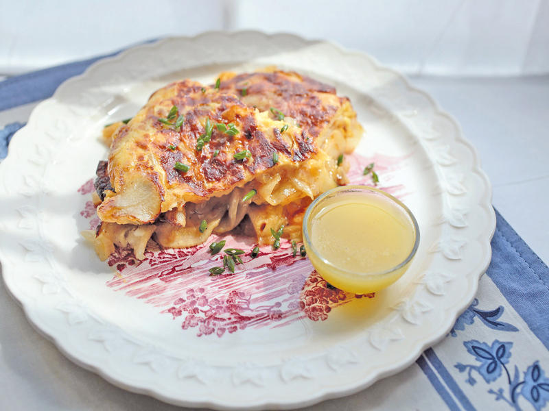 • في قدر، حمي نحو 7 إلى 8 سنتمترات من الزيت النباتي.• قطعي البطاطا إلى شرائح رقيقة بواسطة مقشرة وجفيفيها بمحارم ورقية. اقلي البطاطا بالزيت العميق على دفعات إلى أن تصبح مقرمشة قليلاً. ضعيها جانباً.• في مقلاة كبيرة، حمي بضع ملاعق كبيرة من الزيت، أضيفي إليها البصل، وقليه إلى أن يكتسب لوناً بنياً داكناً، أي نحو 15 دقيقة. ارفعيه عندئذٍ من المقلاة واتركيه ليبرد.• في وعاء كبير، اخفقي البيض مع البصل وطيبيه بالملح والفلفل. أضيفي إليه بعد ذلك البطاطا المقرمشة.• اطلي إحدى المقلاتين غير القابلتين للالتصاق بملعقة كبيرة من الزيت وحميها على حرارة متوسطة إلى مرتفعة. صبي فيها خليط البيض. واصلي الطهو والضغط على الأطراف بواسطة ملعقة مسطحة إلى أن يبدأ لون الجانب السفلي بالتحول إلى بني. ضعي عندئذٍ المقلاة الأخرى على حرارة متوسطة إلى عالية بعد أن تكوني قد طليتها بملعقة الزيت الكبيرة المتبقية. وبحركة سريعة اقلبي التورتيلا في المقلاة الثانية (أما إذا قررت قلبها بالاستعانة بطبق، فيمكنك إعادة ما قد يسقط منها إلى المقلاة).• تابعي الطهو إلى أن يكتسب الجانب الآخر لوناً بنياً فاتحاً من دون التوقف عن الضغط على الأطراف بواسطة الملعقة المسطحة، إن دعت الحاجة. امسحي المقلاة الأولى، اطليها بالزيت، وحميها مجدداً. أعيدي قلب التورتيلا فيها واتركيها على النار إلى أن يشتد وسطها بعض الشيء. ارفعيها عن النار واتركيها لتبرد خارج البراد. من الضروري ألا يكون وسط التورتيلا قد اشتد بالكامل عند تقطيعها. قدميها مع الخبز المحمص وصلصة الأيولي. الماكرون بالتوت وقشرة الشوكولاتة