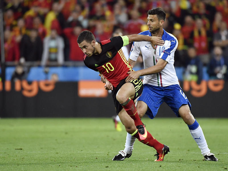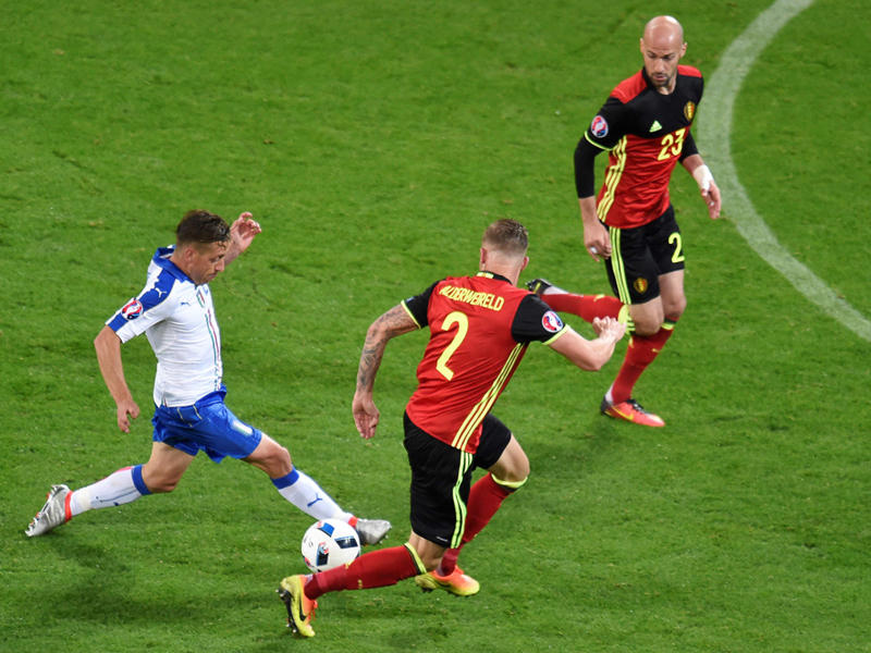 وفي الجولة الثانية، تلعب ايطاليا مع السويد في 17 الجاري، وبلجيكا مع أيرلندا في اليوم التالي.ولم تشهد البطولة غزارة في الاهداف، وكانت نتائجها عادية حتى الآن، واكبرها قبل فوز إيطاليا سجل في مباراة الافتتاح بين فرنسا ورومانيا (2-1)، وويلز مع سلوفاكيا (2-1) والمانيا واوكرانيا (2-صفر).ويفتقد المنتخبان في البطولة عناصر مؤثرة، وإذا كانت إيطاليا تلقت ضرباتها في مركز صناعة اللعب بإصابة لاعبي وسط باريس سان جيرمان الفرنسي ماركو فيراتي ويوفنتوس كلاوديو ماركيزيو وميلان ريكادرو مونتوليفو، فان بلجيكا تعاني غيابات وازنة في خط الدفاع أبرزها قائدها فنسان كومباني (مانشستر سيتي الإنكليزي) ونيكولاس لومبارتس (زينيت سان بطرسبورغ الروسي) وديدريك بوياتا (سلتيك الأسكتلندي) وبيورن انغلز (كلوب بروج).ودفع أنطونيو كونتي مدرب ايطاليا بالحارس المخضرم جانلويجي بوفون، وبثلاثي الدفاع اندريا بارزالي وليوناردو بونوتشي وجورجو كييليني، مع خمسة لاعبين في الوسط هم انطونيو كاندريفا وماركو بارولو ودانييلي دي روسي وايمانويلي جاكيريني وماتيو دارميان والمهاجمين ايدر وغراتسيانو بيليه.وسيرحل كونتي بعد البطولة للاشراف على تشلسي الانكليزي.من جهته، اعتمد مارك فيلموتس مدرب بلجيكا على حارس تشلسي الانكليزي تيبو كورتوا، والمدافعين لوران سيمان وتوبي الدرفيريلد وتوماس فرمايلن ويان فيرتونغن، وتمثلت نقطة القوة في التشكيلة بخط الوسط، حيث يوجد ادين هازار وكيفن دي بروين ومعهما اكسل فيتسل وراديا ناينغولان ومروان فلايني، ودفع بروميلو لوكاكو مهاجما وحيدا.وانطلقت ايطاليا بهجمة مرتدة سريعة وصلت منها الكرة الى ايموبيلي الذي سار بها ثم اطلقها صاروخية، لكن كورتوا ابعدها ببراعة منقذا مرماه من هدف ثان قبل النهاية بست دقائق. بدأت المباراة بإيقاع سريع ومفتوح من الطرفين، لكن الفرصة الاولى كانت بلجيكية في الدقيقة العاشرة من كرة قوية من نحو 30 مترا سددها ناينغولان وارتمى لها الحارس بوفون وحولها الى ركنية، وسدد اللاعب نفسه كرة أخرى من بعيد ايضا تابعت طريقها على يمين المرمى (22).وانتظر الطليان نصف ساعة تقريبا لتهديد مرمى بلجيكا، فبعد كرة غير خطيرة لبيليه على يسار المرمى (29)، خطفوا هدف السبق إثر كرة رائعة من بونوتشي من منتصف الملعب تماما خلف المدافعين، واستقبال اروع من جاكيريني الذي انسل خلف المدافعين ووضعها في الزاوية اليسرى للمرمى لحظة خروج كورتوا للتصدي له (32).واطلق كاندريفا كرة قوية بيسراه ابعدها كورتوا بقبضتيه الى ركنية (35).وسنحت فرصة ذهبية امام الآزوري لتعزيز تقدمه حين تهيأت كرة امام بيليه فارتقى لها وتابعها برأسه، لكنها مرت قرب القائم الايسر مباشرة (36).استمر الاداء متكافئا في الشوط الثاني، فالمنتخب الايطالي لم ينكفئ كعادته الى منطقته للدفاع عن تقدمه، في حين ان المنتخب البلجيكي وجد صعوبة في اختراق الدفاعات الايطالية وتشكيل خطورة كبيرة على مرمى بوفون.وحصلت بلجيكا على فرصة للتسجيل من هجمة مرتدة نموذجية حول منها هازار الكرة الى دي بروين الذي حضرها الى لوكاكو الغائب تماما عن المجريات فأرسلها بيسراه من خارج المنطقة مرت قريبة جدا من القائم الايسر لمرمى بوفون (53)، لكن نظيره كورتوا حال بعد لحظات قليلة فقط دون اهتزاز شباكه ثانية بإبعاد كرة من رأس بيلي كانت في طريقها الى الزاوية اليمنى.ضغط بلجيكاوضغط المنتخب البلجيكي في نصف الساعة الاخير، واشرك فيلموتس المهاجم دريز ميرتنز بدلا من لاعب الوسط ناينغولان، ثم اشرك ديفوك اوريجي ويانيك كاراسكو مكان لوكاكو وسيمان، لكن الدفاع الايطالي بقي متماسكا، وكان يشتت اي كرة تدخل منطقته مباشرة.تحرك هازار في مركزه المفضل في الجانب الايسر جيدا فازدادت خطورة بلجيكا التي كادت تدرك التعادل إثر كرة عالية تابعها اوريجي برأسه عالية قليلا عن المرمى (82).وتكرر مشهد هدف اللحظات الاخيرة في هذه البطولة، اذ اضافت ايطاليا الهدف الثاني في الدقيقة الثالثة من الوقت الضائع من هجمة مرتدة حضر على أثرها كان