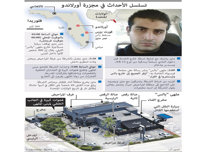 وأبقت السلطات الأميركية على ترجيحها فرضية تحرك منفذ هجوم الملهى الليلي للمثليين في اورلاندو بمفرده بوحي من عقيدة الارهاب المتشدد لتفسير دوافع المذبحة التي نفذها مشيرة الى ماضيه المعقد الذي يتضمن عدة مراحل غامضة. وأصبح مكتب التحقيقات الفدرالي (اف بي آي) والرئيس الاميركي باراك أوباما على قناعة متزايدة بأن هذا المسلم المتدين الأميركي من أصل أفغاني اعتنق عقيدة متطرفة على الانترنت، وانه تصرف بشكل منفرد بوحي من عدة منظمات إرهابية، لكن بدون أن يكون "يأتمر" من إحداها.وقال أوباما بعد اجتماع في المكتب البيضاوي مع مدير مكتب التحقيقات الفدرالي جيمس كومي ووزير الامن الداخلي جيه جونسون: "يبدو ان مطلق النار تصرف بوحي من مختلف مصادر معلومات متطرفة على الإنترنت". وأوضح الرئيس الأميركي انه ليس هناك حتى الآن "ادلة واضحة" توحي بأن هذا الرجل "كان يدار من الخارج" او "يشكل جزءا من مؤامرة اوسع". وشدد اوباما على أن متين "اعلن ولاءه للدولة الاسلامية في اللحظة الاخيرة، لكن لا دليل في هذه المرحلة على انه خضع لقيادتها". وسيتوجه اوباما اليوم الى اورلاندو لتوجيه تحية لضحايا أسوأ عملية إطلاق نار تشهدها الولايات المتحدة.ترامب