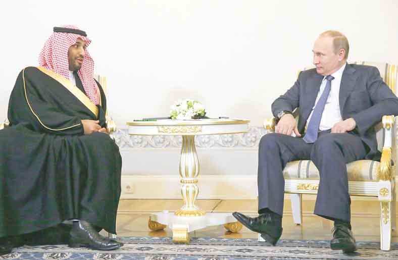 التقى ولي ولي العهد السعودي وزير الدفاع محمد بن سلمان أمس في مدينة سان بطرسبورغ الروسية، الرئيس الروسي فلاديمير بوتين، وبحثا العلاقات الثنائية، وسط تقارب بشأن عدد من الملفات المهمة في منطقة الشرق الأوسط، خصوصاً في ما يخص اليمن وسورية. وأعلن محمد بن سلمان عقب اللقاء أن العاهل السعودي الملك سلمان بن عبدالعزيز سيزور موسكو في القريب العاجل.