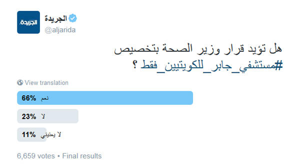 وشارك في الاستفتاء الذي استمر 15 ساعة 6,659 شخص.جدير بالذكر أن، قرار وزير الصحة يوم أمس بتخصيص مستشفى جابر للكويتيين فقط أثار ضجة في مواقع وسائل التواصل الاجتماعي بين رافض ومؤيد.وفيما يلي بعد التعليقات المرافقة لعملية التصويت: F A R I D A: للأمانة من ناحية أحس فيها نسبة عنصرية 10٪ ومن ناحية ثانية أقول هذا من حقنا وأؤيد هالشي.rinad: أؤيد انو مستشفى جابر للكويتين ولا ليش اسمها مستشفى جابر يعني كويت.متقلب لصالح الحق: أي شخص صوت وهو غير كويتي طبيعي سيصوت بلا..!!، 99٪ من الكويتيين موافقين والعالم كله يميز مواطنيننه بالغرب والعرب وآسيا وأمريكا.711101: ماشوف فيه عنصريه ليش مافي مستشفيات الكويت الباقية كلها قاعدين يتعالجون فيها والأولوية لهم.قوت القلوب: نعم وبقوة تعبنا من خياس الوافدين نبي شي لنا خلاص زهقنا نروح من الساعة 7 الصبح يجي دورنا الساعه 1 الظهر من هالوافدين.