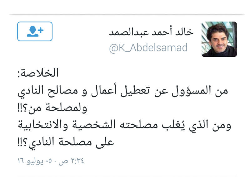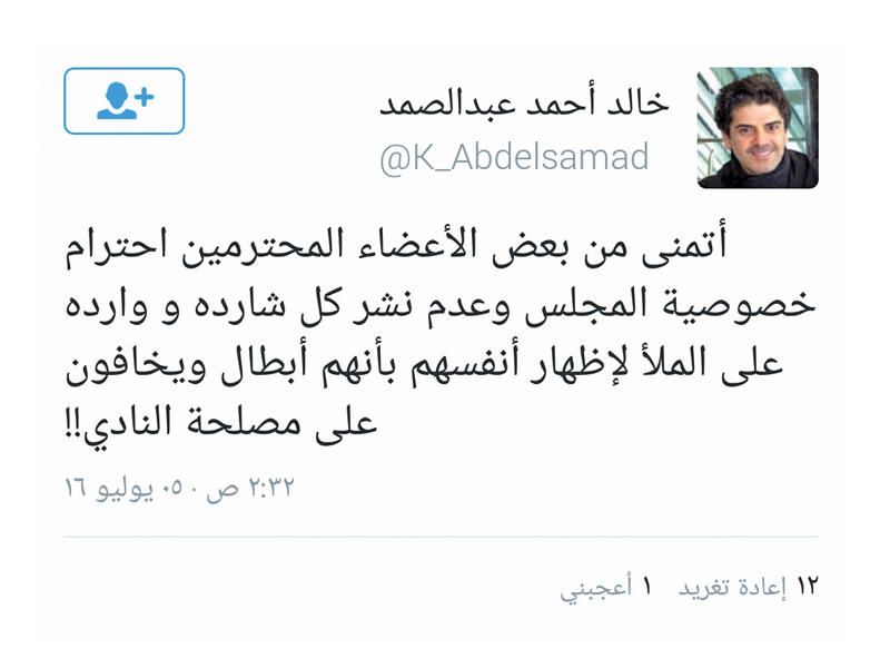 وأوضح: "اعتذرت عن عدم حضور الاجتماع المزعوم في المرة الأولى لظروف خاصة كما اعتذرت في المرة الثانية بسبب عدم قانونية الاجتماع، حيث أبلغني الرئيس أن أمين السر لم يقم بالتنسيق معه مرة اخرى لتحديد جدول الاعمال كما حصل في الاجتماع الملغى، وهذا حق أصيل لرئيس مجلس الإدارة حسب النظام الاساسي"، مذكراً بإلغاء الاجتماع الاول للسنة المالية الحالية، والذي حضره مع 5 اعضاء نتيجة لعدم تنسيق عضو امين السر مع الرئيس في تحديد جدول الاعمال!وأكد عبدالصمد أن هناك خلافات بين الأعضاء، نافياً في الوقت ذاته أن يكون طرفاً فيها وقال: "لا يختلف أحد على أن هناك خلافات حادة بين مجموعة من اعضاء مجلس الادارة، وللعلم لست أنا وزميلي رائد الزعابي طرفاً فيها".واستغرب ما ذكره احد المغردين بأن رئيس النادي يعطل اجتماع مجلس الادارة خوفا من بند ما يستجد من اعمال، وذلك لوجود شبهات تم اكتشافها! متسائلاً عن مصدر هذه المعلومة، وعما إذا كانت تخميناً ام تم تسريبها من قبل احد أعضاء مجلس المجلس المحترمين، متمنياً من الاعضاء احترام خصوصية المجلس وعدم نشر كل شاردة وواردة على الملأ لاظهار انفسهم على أنهم ابطال ويخافون على مصلحة النادي!وزاد: "في آخر اجتماع لمجلس الإدارة تمت الموافقة بأغلبية الأعضاء على تشكيل لجنة للتحقيق في بيع الحديد الخاص بسور النادي وصفقة اللاعب خالد الرشيدي، بالاضافة الى التحقيق في كل المواد التي تم التخلص منها ببيعها خلال هذه الدورة، وأتمنى من اعضاء الجمعية العمومية الاطلاع على محاضر اجتماعات مجلس الادارة وعدم الانجراف وراء الاقاويل والاشاعات الخاصة بقرارات المجلس". وأشار عبدالصمد إلى أن مجلس الإدارة لم يعر أي اهتمام لطلب التحقيق الرسمي الذي تقدم به مع زملائه اعضاء مجلس الادارة رائد الزعابي وفؤاد المزيدي وعبدالرزاق معرفي في 9 ديسمبر 2013 حول صفقة خالد الرشيدي، ليأتي خلال الاجتماع الأخير ويعتمد الشكوى بالاستناد الى ذات الكتاب وبنفس المضمون"، متسائلاً: "ما سبب إهمالها في السابق وتفعيلها حاليا ولمصلحة من؟ أم هي مسألة مزاج؟".وبعد كل توضيحاته ختم تغريداته بالتساؤل: "من المسؤول عن تعطيل اعمال ومصالح النادي، ولمصلحة من؟ ومن الذي يغلب مصلحته الشخصية والانتخابية على مصلحة النادي؟".