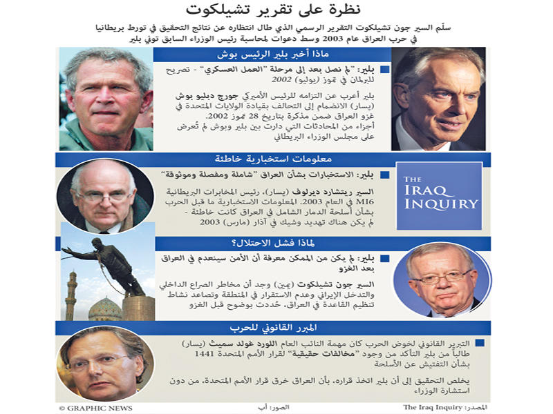 ويرى خبراء أن مشاركة بريطانيا المثيرة للجدل في حرب العراق في 2003 اثارت شعورا عميقا بالتوجس من عمليات التدخل العسكري ما زال يؤثر اليوم في السياسة الخارجية للبريطانيين.وقال مالكولم تشالمرز من المعهد الملكي للخدمات المتحدة (آر يو اس آي)، إن هذه الحرب "اعادت تعريف السياسة الامنية البريطانية"، وأضاف: "يمكن ان تنسب تحفظات الحكومة البريطانية على ارسال قوات برية إلى ليبيا او سورية إلى حرب العراق".وشاركت بريطانيا في فرض منطقة للحظر الجوي برعاية حلف شمال الأطلسي خلال الانتفاضة على معمر القذافي في 2011. لكن هذه المهمة كانت محدودة.ويشن البريطانيون حاليا عمليات قصف ضد "داعش"، لكن البرلمان عارض في 2013 توجيه ضربات جوية إلى نظام بشار الأسد.وقالت جين كينينمونت، من المركز الفكري "شاتهام هاوس"، إن "النقاش الذي جرى حينذاك في البرلمان البريطاني هيمن عليه العراق بالكامل". وأضافت "حتى في 2005 وفي أوج عمليات التطهير الاتني في دارفور، كان من الصعب الدفاع عن عملية تدخل إنساني".وكانت بريطانيا بررت تدخلها في العراق، بوجود أسلحة للدمار الشامل. لكن بعد الاخفاق في العثور على أي من هذه الأسلحة، اصبح الهدف صدام حسين او تخليص شعب من ديكتاتور.وصرحت جين كينينمونت بأن هذه الحرب "جعلت الرأي العام يشكك بعمق في عمليات الظتدخل العسكرية، وخصوصا العمليات التي تقدم على انها انسانية".وقالت جين كينينمونت: "شهدنا الامر نفسه في الولايات المتحدة"، مشيرة إلى ان "الانسحاب الأميركي من التزاماتهم العسكرية في الشرق الاوسط تحول إلى حجة رئيسة في حملة" باراك اوباما الرئاسية عام 2008.وأوضحت ان البريطانيين، وبدلا من التدخل بشكل مباشر، اصبحوا يعملون اكثر مع القوى في المنطقة، مثل الاردن ودول الخليج. وأضافت "لكن المشكلة ان هذه القوى ليست قوية جدا دائما".ورأى جون بيو من جامعة "كينغز كوليدج" في لندن أن حرب العراق ادت إلى وضع من "اللاسياسة" حيال سورية ولسنوات من قبل البريطانيين.وأضاف "توقفنا عن التفكير بجدية في وسائل خفض العنف، وإحلال الاستقرار في المنطقة، والعمل لاقامة ممرات انسانية، وممارسة مزيد من الضغط الدبلوماسي على نظام الاسد".ويأمل المركز الفكري للمحافظين الجدد "هنري جاكسون سوسايتي" في ألا يؤدي نشر تقرير شالكوت إلى مزيد من الكبح في السياسة الخارجية.وقال آلان ميندوزا المسؤول في المعهد "كما يحدث في كل نزاع، هناك عدد من الدروس التي يجب استخلاصها".وأضاف "يجب ألا نستخلص ان كل عمليات التدخل سلبية، او اننا سنكون مسؤولين بشكل ما عن كل التغييرات الكبيرة التي تهز الشرق الأوسط".وتابع ميندوزا: نشر تقرير شالكوت يجب ان يسمح بتحسين اتخاذ القرار بمعايير تحليلية أكثر صرامة، لكن شرط ألا يؤدي ذلك إلى جمود سيشكل برأيه "خطأ مميتا للأمن البريطاني".(عواصم - وكالات)