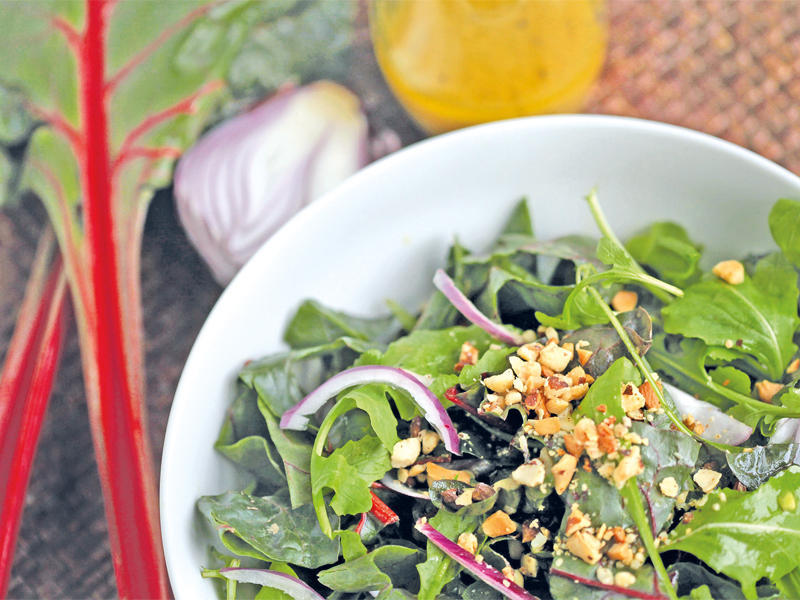 • في وعاء صغير، اخلطي زيت الزيتون مع الخل، عصير الليمون الحامض، العسل، خردل ديجون، الملح، والفلفل. تابعي الخفق إلى أن يشتد الخليط ويزداد كثافة. تذوقيه وعدلي مطيباته حسبما تشائين، ثم ضعيه جانباً.• في وعاء كبير، اخلطي الجرجير مع السلق، البصل، وربع كوب من الصلصة التي أعددتها.• وزعي الخليط على ستة أطباق، رشي فوقه البندق، وقدميه مع ما تبقى من صلصة في طبق جانبي.في الحصة: 176 سعرة حرارية (67% من الدهون)، 14 غراماً من الدهون (2 غرام من الدهون المشبعة)، 13 غراماً من النشويات، 3 غرامات من البروتين، 521 مليغراماً من الصوديوم، 0 مليغرام من الكولسترول، و2 غرام من الألياف.التحميص للتخلّص من القشرة