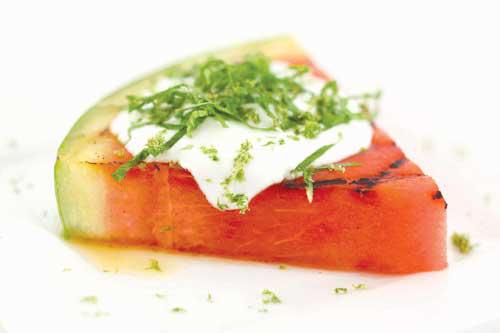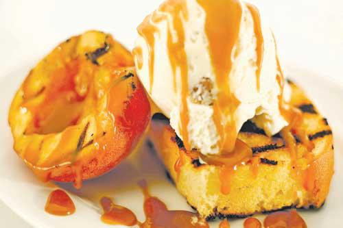 ثم حضري العشاء على أن تتألف التحلية من البولينتا المشوية (عصيدة من دقيق الذرة). ربما تعرفين البولينتا الساخنة التي تكون خفيفة ورقيقة، لكن دعي هذه النسخة تنتقع في صينية ثم قطعيها إلى شرائح. يمكنك القيام بهذه الخطوة قبل يوم أو يومين كي لا تقلقي بشأن عملية التحضير ووقت التقديم. اشوي الشرائح، لدقيقة أو دقيقتين مجدداً، ثم قدميها مع سكب ملعقة من جبنة المسكربون وقبضة من التوت الطازج والقليل من شراب القيقب الداكن. لا شك في أن ضيوفك سيندهشون من هذه الوصفة! لا داعي لإخبارهم بأنك حضّرتِها خلال بضع دقائق.هل يشمل ضيوفك شخصاً ينتقد طعامك دوماً أو يحتسب السعرات الحرارية التي يستهلكها؟ يمكنك شوي البطيخ!إذا لم تجربي شوي البطيخ يوماً، نؤكد لك أنه خيار مدهش! قطعي بطيخة إلى شرائح سميكة (بعد نزع البذور طبعاً) وادهني عليها زيت الزيتون واشوي الشرائح إلى أن تتحمر قليلاً وتظهر عليها علامات الشوي على كل جنب. يعزز الشوي النكهات ويركّزها تزامناً مع تخفيف المذاق الحلو وإضافة نكهة مدخنة. اسكبي فوق الشرائح كمية من اللبن اليوناني وعصير الليمون الطازج والنعناع وبعض العسل.بطيخ مع النعناع والليمون والعسل واللبن (4 )مدة التحضير: 15 دقيقةالمقادير- 4 إلى 6 شرائح سميكة من البطيخ المنزوع البذور.- زيت زيتون.- عصير وبرش حبتَي ليمون.- عسل.- باقة من النعناع الطازج والمفروم.- لبن يوناني.الطريقة• سخني المشواة على حرارة متوسطة أو مرتفعة، ثم ادهني كل شريحة من شرائح البطيخ بزيت الزيتون على الجهتين.• اشوي الشرائح إلى أن تصبح طرية بعض الشيء وتظهر عليها علامات الشواء، مدة دقيقتين تقريباً لكل جهة. ثم انزعيها عن النار. • ضعي شريحة على كل طبق. اسكبي فوقها القليل من عصير الليمون والعسل ثم كتلة من اللبن.• رشّي عليها قليلاً من برش الليمون وورق النعناع. قدمي الطبق فوراً.بولينتا مشوية (6 )مدة التحضير: 45 دقيقة، بالإضافة إلى وقت التبريدالمقادير- ليتر ماء.- كوب من دقيق الذرة الخشن أو متوسط الخشونة.- ملعقة صغيرة من الملح.- 3 ملاعق كبيرة من الزبدة.الطريقةفي وعاء صغير، اغلي الماء على نار خفيفة. ثم اسكبي فيها دقيق الذرة ببطء وحركيه لتجنب تشكّل الكتل. أضيفي الملح واطبخي الخليط وحركيه بشكل متكرر إلى أن يصبح دقيق الذرة طرياً ورقيقاً، بين 20 و30 دقيقة (تتفاوت المدة بحسب درجة الطحن والماركة المستعملة). يجب أن يكون دقيق الذرة سميكاً جداً، لكن إذا جفّ أكثر من اللزوم قبل أن يصبح طرياً، أضيفي المزيد من الماء عند الحاجة. حين يصبح دقيق الذرة جاهزاً، أضيفي الزبدة. ثم انزعي الخليط عن النار. وزعي البولينتا في صينية بلاستيكية مدهونة بالزبدة وملّسيها كي تصبح بسماكة 3 أو 4 إنش. ثم غطّيها وضعيها في البراد إلى أن تصبح باردة وصلبة. يمكن تحضير البولينتا قبل يومين.بولينتا مشوية مع القيقب والتوت الطازجالمقادير - بولينتا جاهزة ومقطعة إلى شرائح أو بأشكال منتقاة.- رذاذ طبخ.- كوبان من جبنة المسكربون.- 473 ملل من التوت.- شراب قيقب داكن.الطريقة• سخني المشواة على حرارة متوسطة. رشّي الزيت على شرائح البولينتا من الجهتين. اشوي الشرائح إلى أن تتحمر قليلاً وتظهر عليها علامات الشوي، مدة دقيقتين لكل جهة. كوني حذرة عند تقليب شرائح البولينتا لأنها ستكون هشة جداً. انزعيها عن النار.• في وقت تقديم الطعام، ضعي شريحة أو شريحتين في كل طبق. ثم أضيفي كمية من جبنة المسكربون وقبضة من التوت الطازج. اسكبي شراب القيقب فوق الطبق وقدميه فوراً.قالب حلوى مع الخوخ وصلصة الكراميل (6 )مدة التحضير: 50 دقيقةمقادير صلصة الكراميل: - ثلث كوب من عصير العنب.- كوب وثلث من السكر.- نصف كوب ماء.- ملعقة صغيرة من شراب الذرة.- كوب وثلاثة أرباع من الكريما الثقيلة.- 6 ملاعق كبيرة من الزبدة.- ربع ملعقة صغيرة من الملح.- ملعقة صغيرة وربع من خلاصة الفانيلا.الطريقة• اسكبي عصير العنب في مقلاة صغيرة على نار متوسطة أو مرتفعة. أميلي المقلاة بحذر فوق النار. ثم انزعيها عن النار وضعي العصير جانباً.• في طنجرة كبيرة، اخلطي السكر والماء 