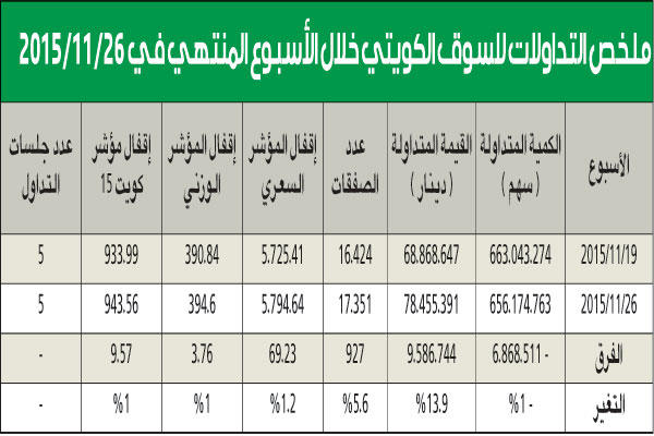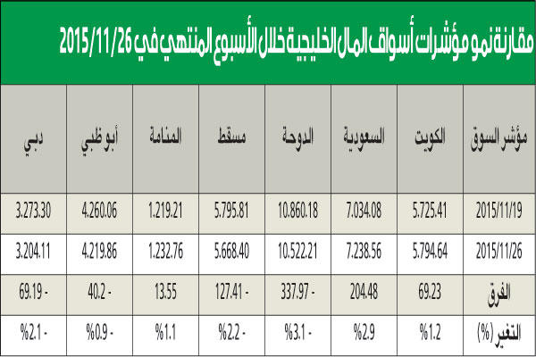 «تاسي» وارتداد جيدبعد أن استطاع مؤشر تاسي المحافظة على مستوى 7 آلاف نقطة النفسي خلال تعاملات الأسبوع قبل الماضي، ورغم تذبذب اسعار النفط الحاد، عاد خلال آخر ثلاث جلسات وسجل نموا كبيرا، ليبتعد فوق مستواه النفسي ويسجل اقفالا مفاجئا على مستوى 7238.56 نقطة، مضيفا 24.48 نقطة، وكانت الجلسات الاخيرة هي الداعم لكن بسيولة منخفضة قياسا على سيولة جلسات مرتفعة سابقا ولم تتجاوز بنهاية التعاملات 4.5 مليارات ريال.ومع اقتراب إعلان الموازنة للعام القادم يزداد القلق من خفض الانفاق الحكومي تحسبا لاستمرار أسعار نفط منخفضة، رغم بعض التقارير التي تؤكد قوة متانة المالية السعودية، والتي تتصدر اقتصادات عالمية من حيث حجم الدين العام نسبة من الناتج المحلي الاجمالي، والذي لا يتجاوز 2 في المئة خلال عام 2014 وهو من اقل النسب على مستوى العالم.ومثل هذه التقارير قد تعطي أريحية لصانع القرار بالابقاء على حجم الانفاق الحكومي حول مستويات العام السابق، لكنه غير مؤكد حتى تظهر الميزانية بعد ثلاثة أسابيع من الآن، وهي الفترة التي ستتعرض خلال تداولات السوق للتذبذب وعينها على اسعار النفط التي استقرت عند مستوياتها الحالية عند نحو 45 دولارا لمزيج برنت.«الكويتي» وتداول الأخبارتداولات السوق الكويتي خلال الاسبوعين الماضيين كانت تحت وقع أخبار خاصة ببعض الشركات، كان لها الأثر الواضح على اتجاه مؤشرات السوق الرئيسية وحركة تعاملاته، وانتهى الاسبوع الاخير في نوفمبر على مكاسب متقاربة لمؤشرات سوق الكويت للاوراق المالية الثلاثة.وربح «السعري» 1.2 في المئة، تعادل 69.23 نقطة ليقفل على مستوى 5794.64 نقطة، بينما اكتفى مؤشرا السوق الوزنيان بنسبة 1 في المئة، تعادل 3.76 نقاط على مستوى المؤشر الوزني، ليقفل على مستوى 394.6 نقطة، و9.57 نقاط على مؤشر كويت 15 ليقفل على مستوى 943.56 نقطة. وبعد خبر الاتصالات السعودية الكبير، الذي افصحت من خلاله عن نيتها شراء بقية اسهم فيفا التي لا تمتلكها، وهي 74 في المئة، منها 24 في المئة بأيدي جهات حكومية كويتية، و50 في المئة لدى مواطنين ومحافظ وصناديق، حرك خبران أسهما أخرى، خصوصا كتلة اجيليتي وسهم بتروغلف، حيث استفادت أسهم تابعة لكتلة اجيليتي من خبر الوطنية العقارية، الخاص بحقها في استعادة تشغيل المنطقة الحرة.كما استفاد سهم بتروغلف من خبر عقد جديد في مصر، واخبار تتداول عن تأهيل الشركة للمناقصات الكويتية، والذي سيفتح لها بابا جديدا من ابواب التدفقات النقدية والارباح، متى استطاعت التنافس على عقود حكومية مستمرة ومتنوعة الحجم.وكان لهذه الاخبار وقع ايجابي على الاسهم ذات العلاقة من جهة وبعض الاسهم القريبة منها، عوضت هدوء الاسهم المرتبطة بصفقة الاتصالات، حيث تراجع نشاطها لتسجل السيولة ارتفاعا بنسبة قريبة من 14 في المئة، مقارنة بالاسبوع الاسبق، بينما تراجع حجم المضاربات ليحد من النشاط الاجمالي للسوق وبنسبة 1 في المئة، وارتفع عدد الصفقات بنسبة 5 في المئة تقريبا.وسجل مؤشر المنامة، بعد سلسلة طويلة من التراجعات المحدودة بين أسبوع وآخر، ارتدادا خلال الاسبوع الماضي، وانضم الى قافلة الرابحين الصغيرة، لكن بنمو واضح *بلغ 1.1 في المئة، ليقفل على مستوى 1232.76 نقطة مضيفا 13.55 نقطة.استمرار التراجعسجلت مؤشرات ثلاث دول خليجية خسائر كبيرة خلال الاسبوع الماضي، جاء بعضها استمرارا لحالة من فقدان الوزن، وهو القطري الذي استمر في تسجيل خسائر كبيرة متخليا عن مستوياته السابقة مقفلا على مستوى 10522.21 نقطة فاقدا 337.97 نقطة تعادل 3.1 في المئة، وكان لتراجع اسعار الطاقة المستمر دور في مثل هذه الخسائر.وفقد مؤشر السلطنة 2.2 في المئة، تعادل 127.41 نقطة، ليقفل على مستوى 5668.4 نقطة، وبعد حالة من التماسك استمر عليها نحو شهر وبشكل مخالف لبقية الاسواق المجاورة التي شهدت تذبذبا حادا مال الى التراجع، لكنه استسلم في نهاية المطاف وتحت ضغط أسعار نفط خليجي يباع تحت مستوى 40 دولارا ليفقد أكثر من نقطتين مئويتين.وبسلبية مستمرة يتراجع مؤشر سوق دبي، ويفقد الزخم السابق 