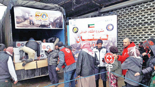 أعلنت جمعية الهلال الأحمر الكويتي، أمس، توزيع مساعدات جديدة على 600 أسرة سورية نازحة في لبنان، ضمن حملة «الشتاء الدافئ 2016»، التي أطلقتها لمساعدة 30 ألف أسرة نازحة سورية في لبنان.وقال موفد الجمعية إلى لبنان د. مساعد العنزي في تصريح لـ «كونا» إنه «تم توزيع مساعدات غذائية ومنظفات وبطانيات على 600 أسرة نازحة في منطقة زحلة بالبقاع وبلدة الزعرورية في جبل لبنان، إضافة إلى توزيع حلوى وهدايا للأطفال».