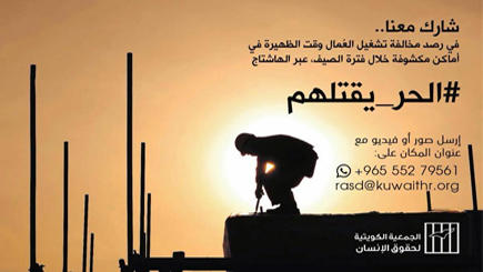 وأشاد العجمي بالقرار الإداري للهيئة العامة للقوى العاملة رقم 535 لسنة 2015 بشأن حظر تشغيل العمال في الأماكن المكشوفة من الساعة 11 ظهراً إلى الساعة 4 مساءً خلال الفترة من أول يونيو وحتى نهاية شهر أغسطس والذي يعتبر أحد المؤشرات التي تعكس ثقافة احترام حقوق الإنسان بشكل عام وحقوق العمال بشكل خاص ومراعياً للصالح العام ويتوافق مع التزامات الكويت بتطبيق معايير العمل الدولية.واعتبر العجمى إن مثل هذه القرارات تعزز من مكانة الكويت فى حماية حقوق الإنسان خاصة وأن الكويت أصبحت مركزاً للعمل الإنساني فى ظل القيادة الإنسانية لصاحب السمو أمير البلاد الشيخ صباح الأحمد الجابر الصباح حفظه الله ورعاه. وصرّح العجمي أن الجمعية أطلقت حملة #الحر_يقتلهم وذلك كمساهمة من الجمعية لمساندة الجهود الحكومية فى التصدي لمثل هذه الانتهاكات وإشراك المجتمع فى رصدها وإبلاغ الجهات المختصة بذلك.من ناحية أخرى، قال منسق الحملة مشاري السند أنها جاءت لخلق ثقافة مجتمعية مساندة لحقوق العمال ومؤيدة للجهود الحكومية في التصدي لهذه الانتهاكات.وأضاف السند بأن الحملة سوف تستخدم هاشتاق #الحر_يقتلهم لخلق تفاعل ومشاركة مجتمعية مع الحملة عبر مواقع التواصل الاجتماعي، كما سيتم تخصيص رقم واتس اب لاستقبال الصور ومقاطع الفيديو وسوف يقوم فريق الحملة بالتأكد منها ورفع تقرير إلى الجهات المختصة.ودعا السند جميع أفراد المجتمع إلى التعاون مع الحملة كون هذه الانتهاكات تمثل انتهاك صارخ لحقوق الإنسان وتسئ إلى سمعة بلدنا الحبيبة وتخالف القيم النبيلة التي تميز بها المجتمع الكويتي.