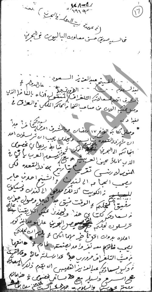 في المقال السابق ذكرت أن أمير الكويت الراحل الشيخ أحمد الجابر، رحمه الله، سافر إلى لندن في عام 1919 نيابة عن عمه الشيخ سالم المبارك تلبية لدعوة من الملك جورج الخامس لحضور احتفالات الانتصار في الحرب العالمية الأولى. ونشرت أيضاً رسالة الشيخ أحمد للملك جورج التي يشكره فيها على الدعوة ويهنئه بمناسبة الانتصار في الحرب. وطالما أننا في موضوع هذه الزيارة التاريخية، فإنه من المفيد أن نذكر في مقال اليوم بعض التفاصيل المرتبطة بالملك فيصل بن عبدالعزيز آل سعود، الذي حضر أيضاً هذه المناسبة نيابة عن والده الملك عبدالعزيز بن عبدالرحمن آل سعود، وكان في السفينة نفسها التي نقلت الشيخ أحمد الجابر إلى لندن. في مقال اليوم والمقالات القليلة المقبلة نعرض لقرائنا الكرام بعض الوثائق التي تنشر للمرة الأولى بخصوص زيارة الملك فيصل إلى لندن في ذلك العام، وبعض التفاصيل المرتبطة بها. ونبدأ اليوم بنشر رسالة من معاون القنصل البريطاني في البحرين، التي يؤكد فيها أن الوقت ضيق جداً وأنه يجب على الملك عبدالعزيز أن يرسل أحد أبنائه ومرافقيه إلى البحرين للقيام بالمهمة إلى لندن... وإليكم نص الرسالة: "وصلني كتابكم المؤرخ 17 رمضان وبالشرف أعرض لسعادتكم متأخراً جداً أن شهر ذي القعدة مناسب ولهذا يجب أن ترسلون أحد أنجالكم إلى البحرين بأسرع ما يمكن وأن ضابط بريطاني مخصوص الذي كاملا يحسن العربية مع معرفة رسوم العرب يأتي في المنور لارنس تقريبا بتاريخ 23 ذي القعدة لكي يصحب الجماعة الى لندن والشيخ احمد بن جابر من الكويت كذلك مدعوا الى لندن وسيكون رفيق نجلكم....".