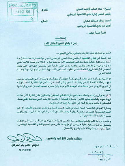 أعلن أمين سر نادي القادسية المساعد ناصر الشرهان تقديمه استقالته من مجلس إدارة النادي، تاركا المجال لغيره من رجالات "الأصفر" لشغل المكان.وأكد الشرهان في تصريح لـ"الجريدة" أن الأجواء في الرياضة بالكويت لم تعد مواتية لتقديم المزيد، بعد 15 عاماً من العمل التطوعي في إدارة القادسية، وأيضا قبل الانضمام لمجلس الإدارة عام 2003.