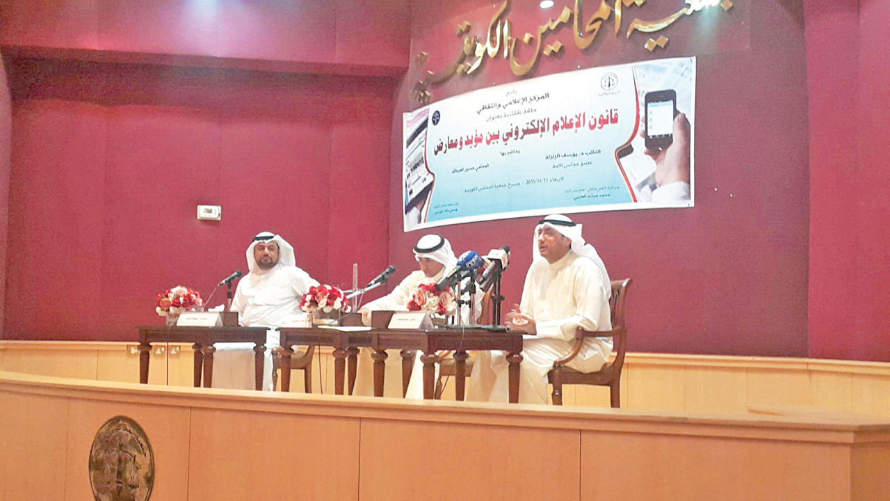 في موازاة احتفال الكويت بذكرى صدور دستورها، شهدت جمعية المحامين الكويتية مناظرة بين النائب يوسف الزلزلة الذي تبنى الرأي المؤيد للمشروع المقدم من الحكومة بشأن الإعلام الإلكتروني وممثل الجمعية المحامي حسين العبدالله الذي شن هجوماً لاذعاً على القانون.